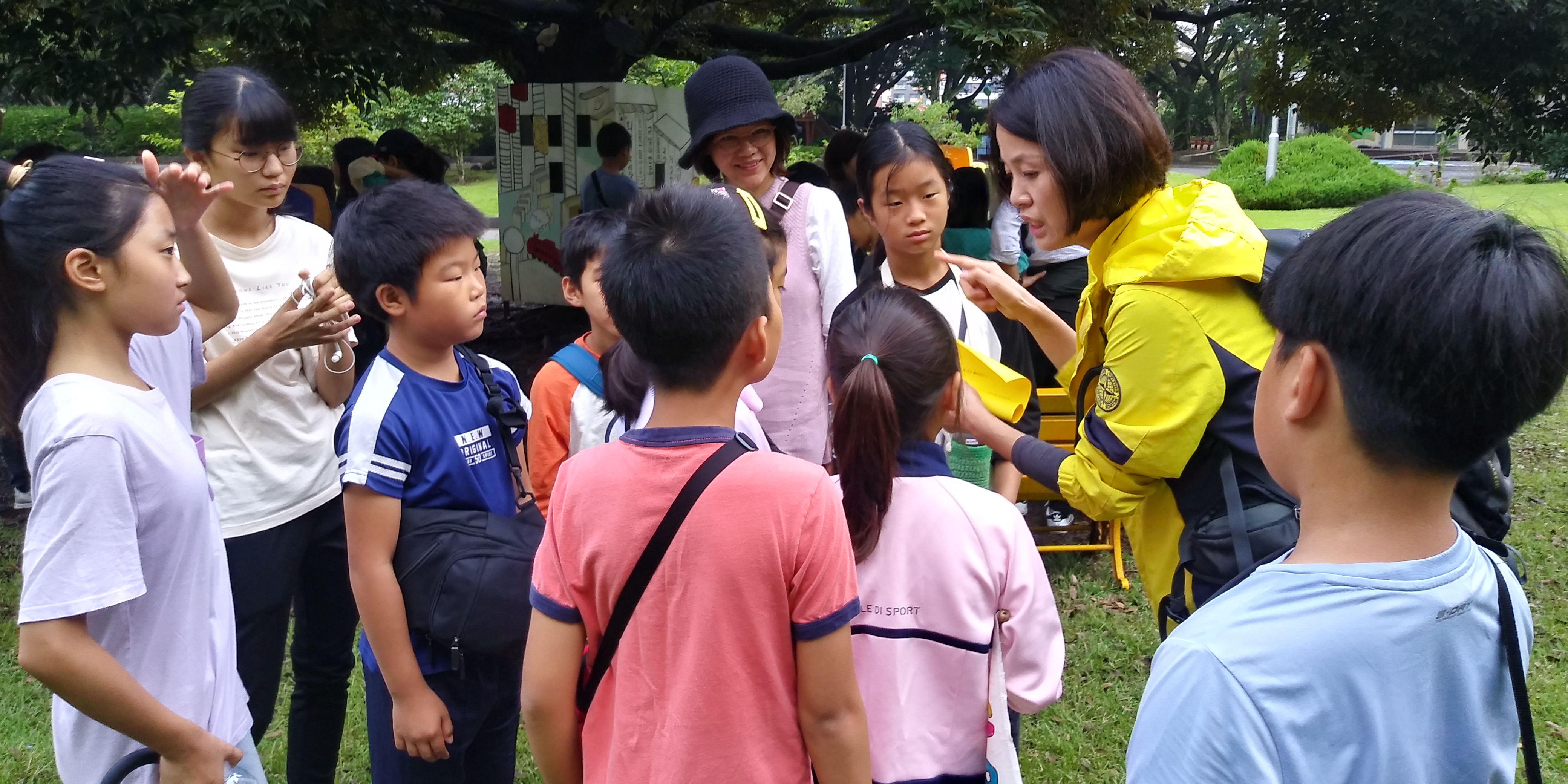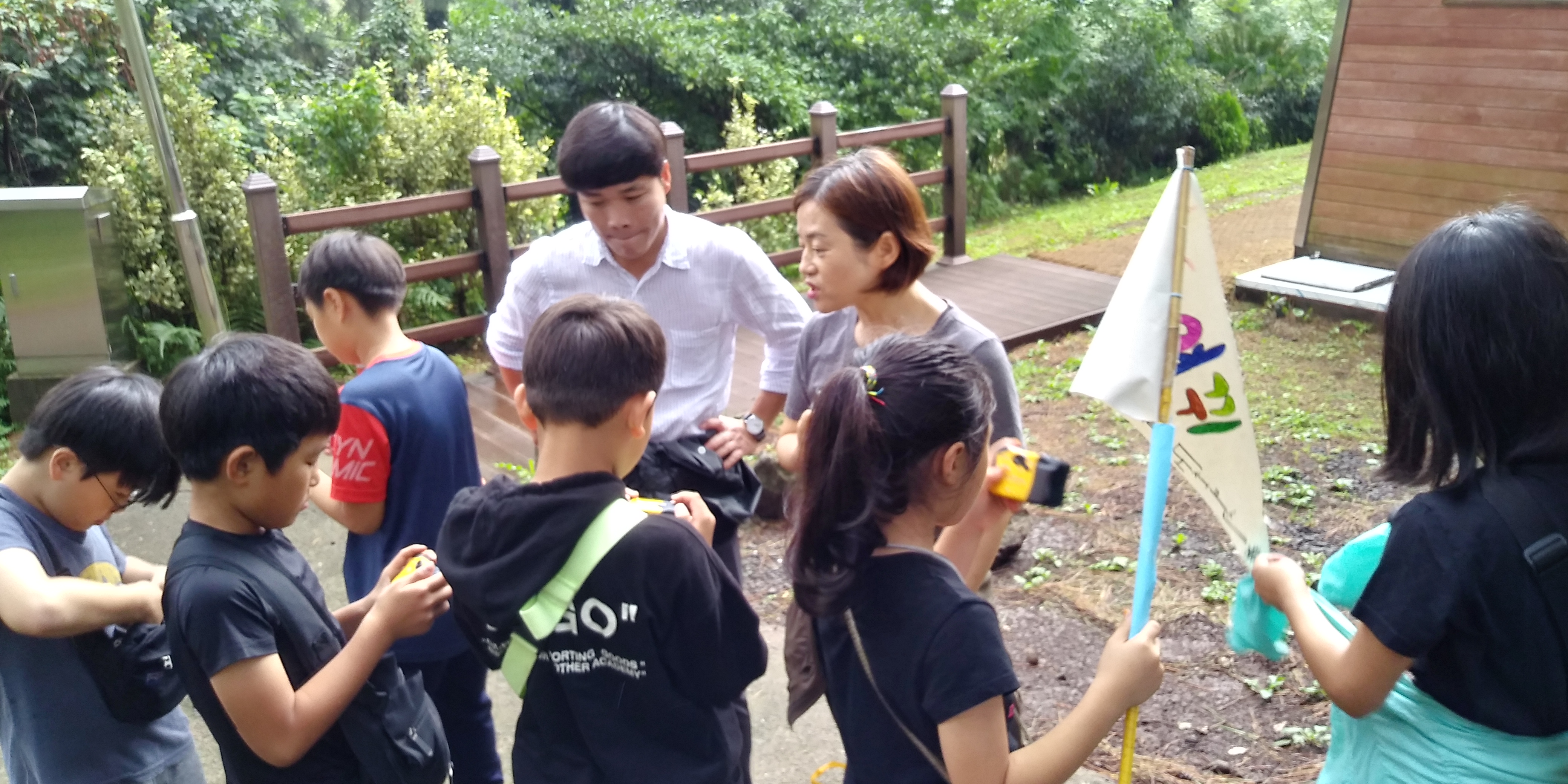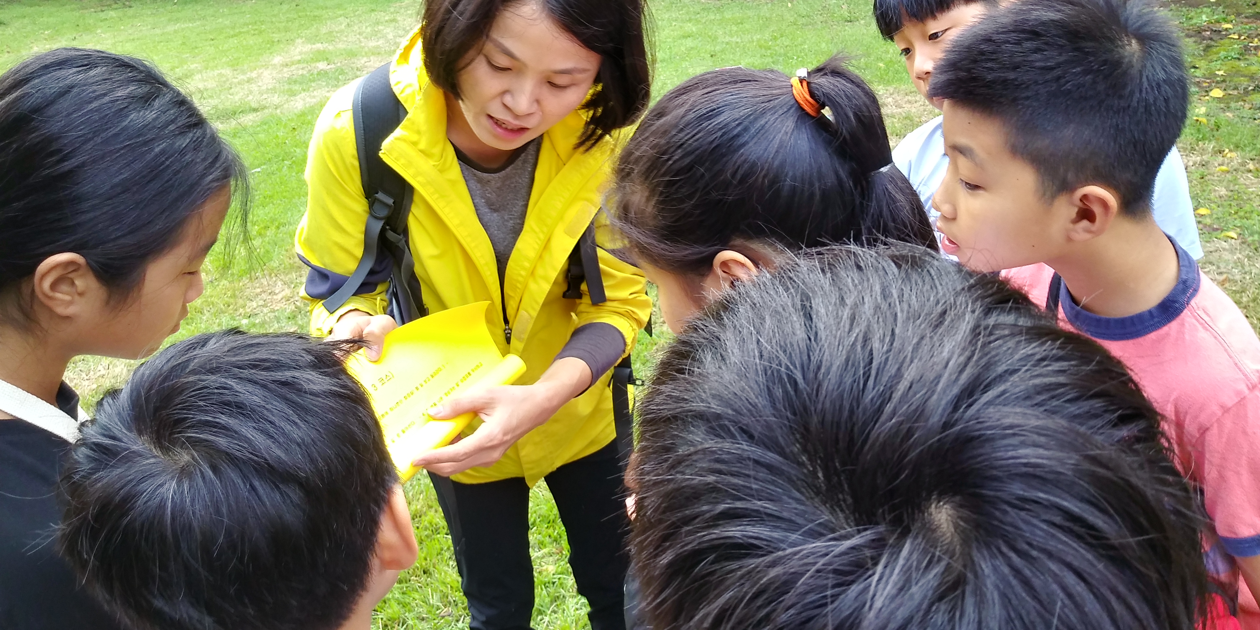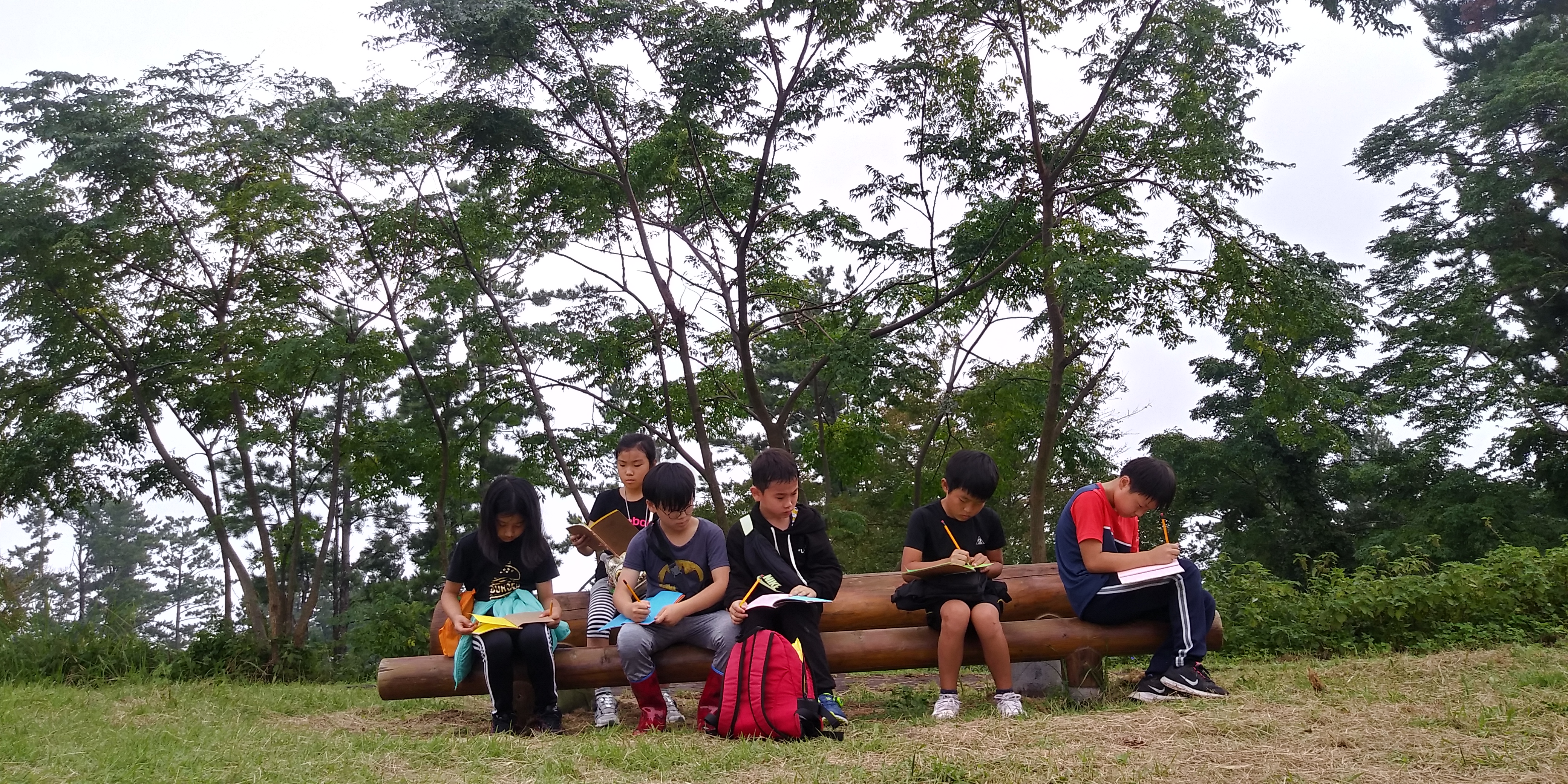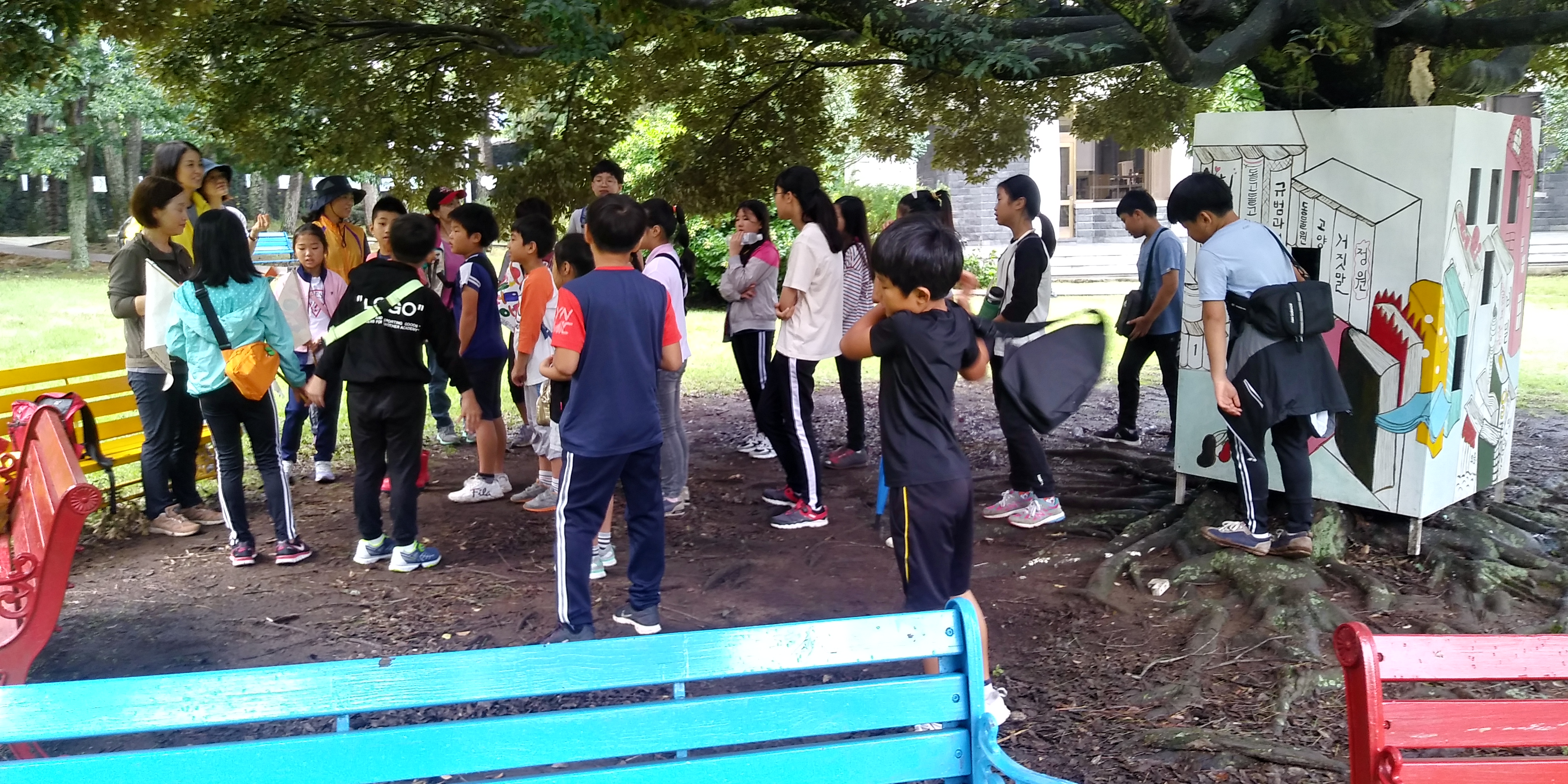 꿈바당 어린이 도서관 잔디밭에 모였다.