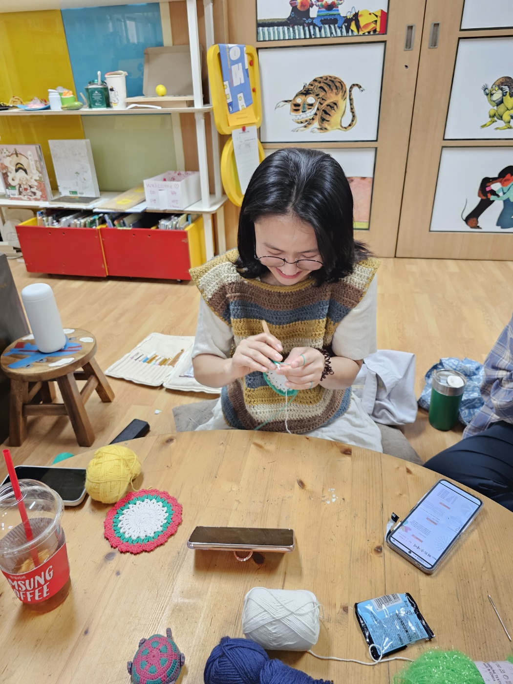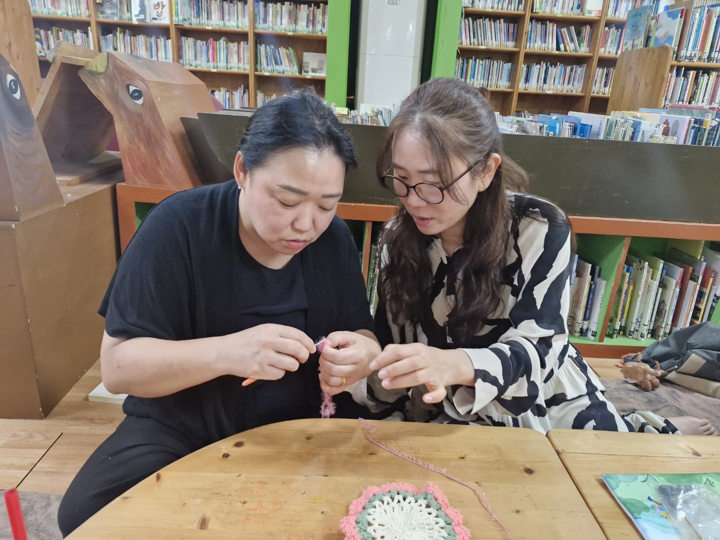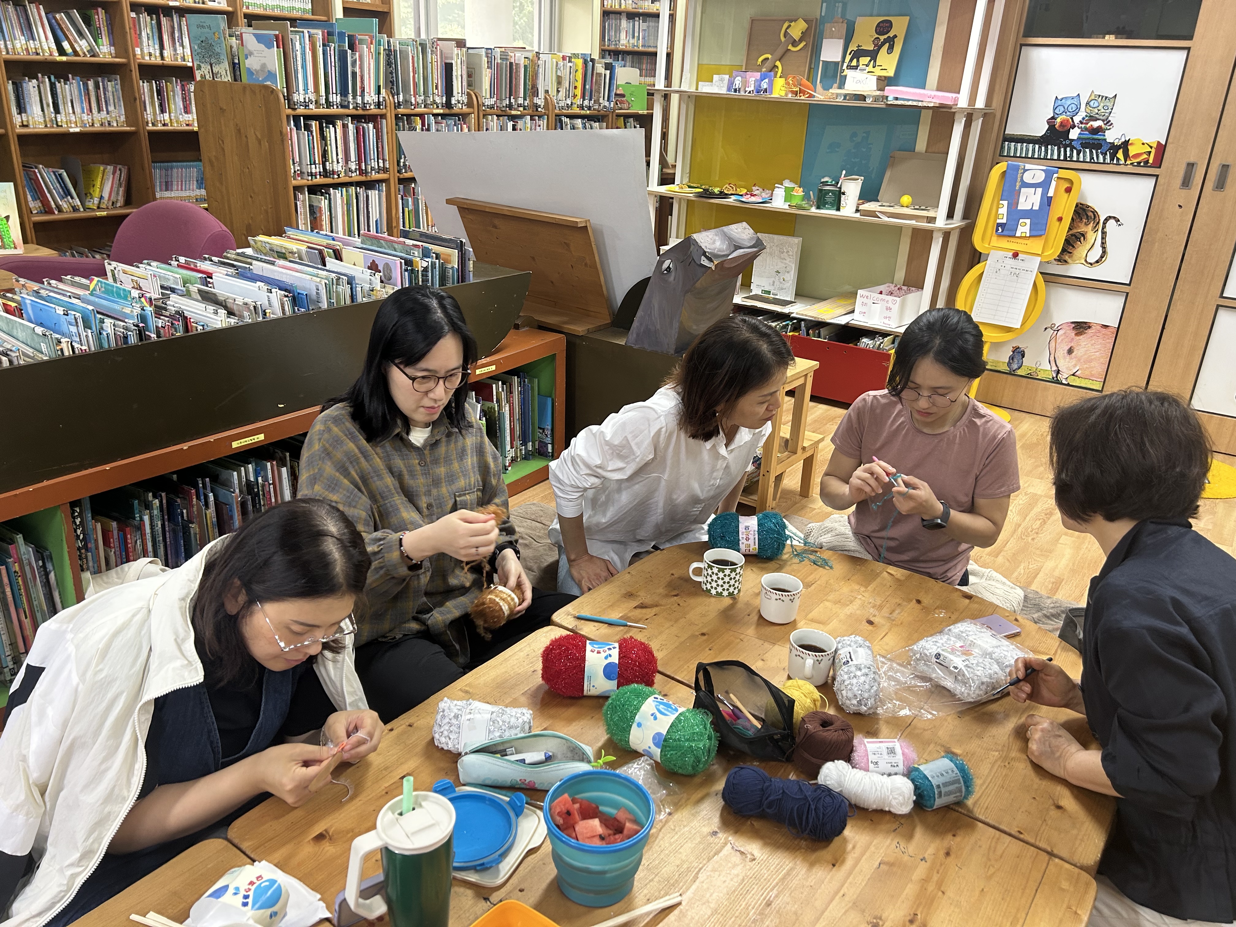 도서관에서 수세미 뜨기에 집중합니다.
