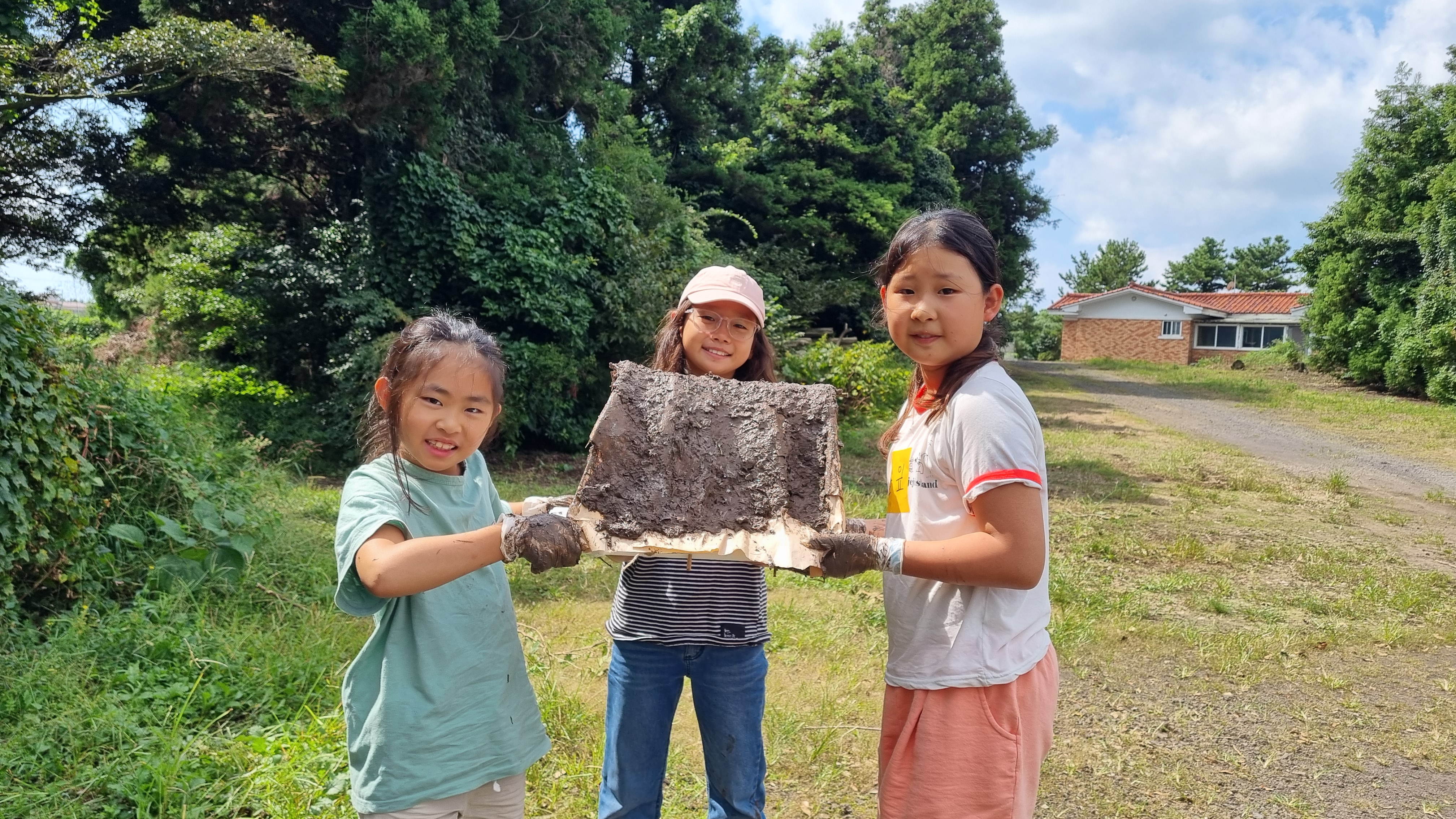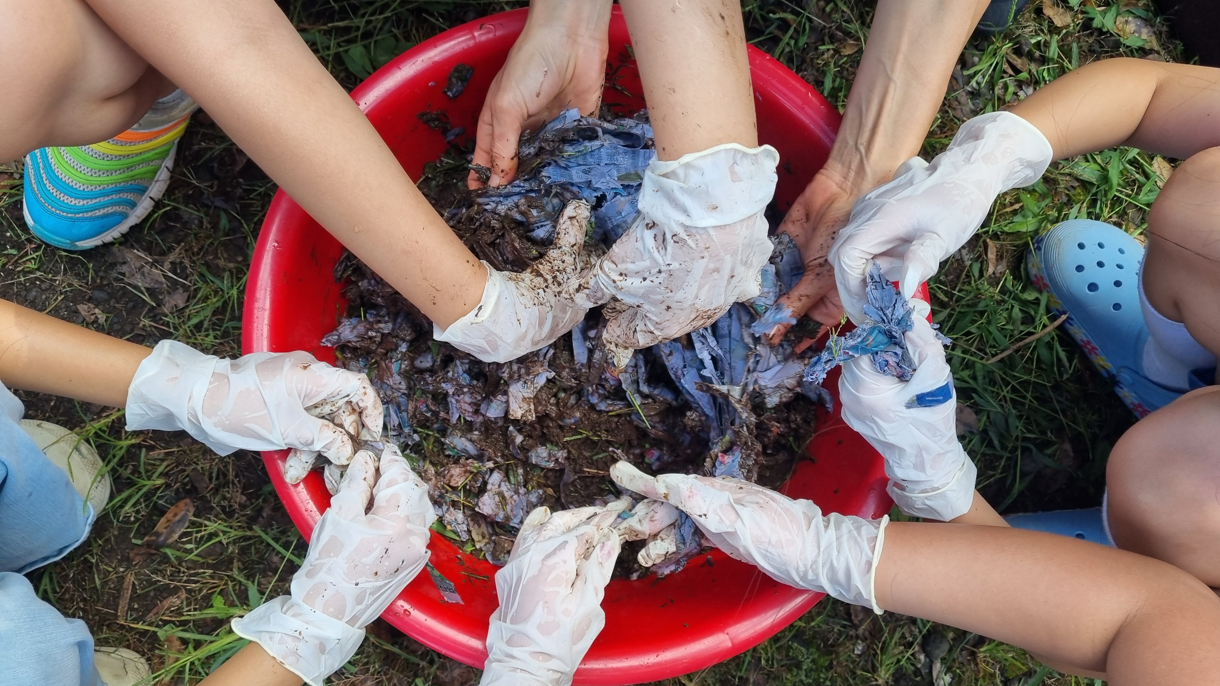 준비해온 신문지와 흙, 풀을 섞는다.