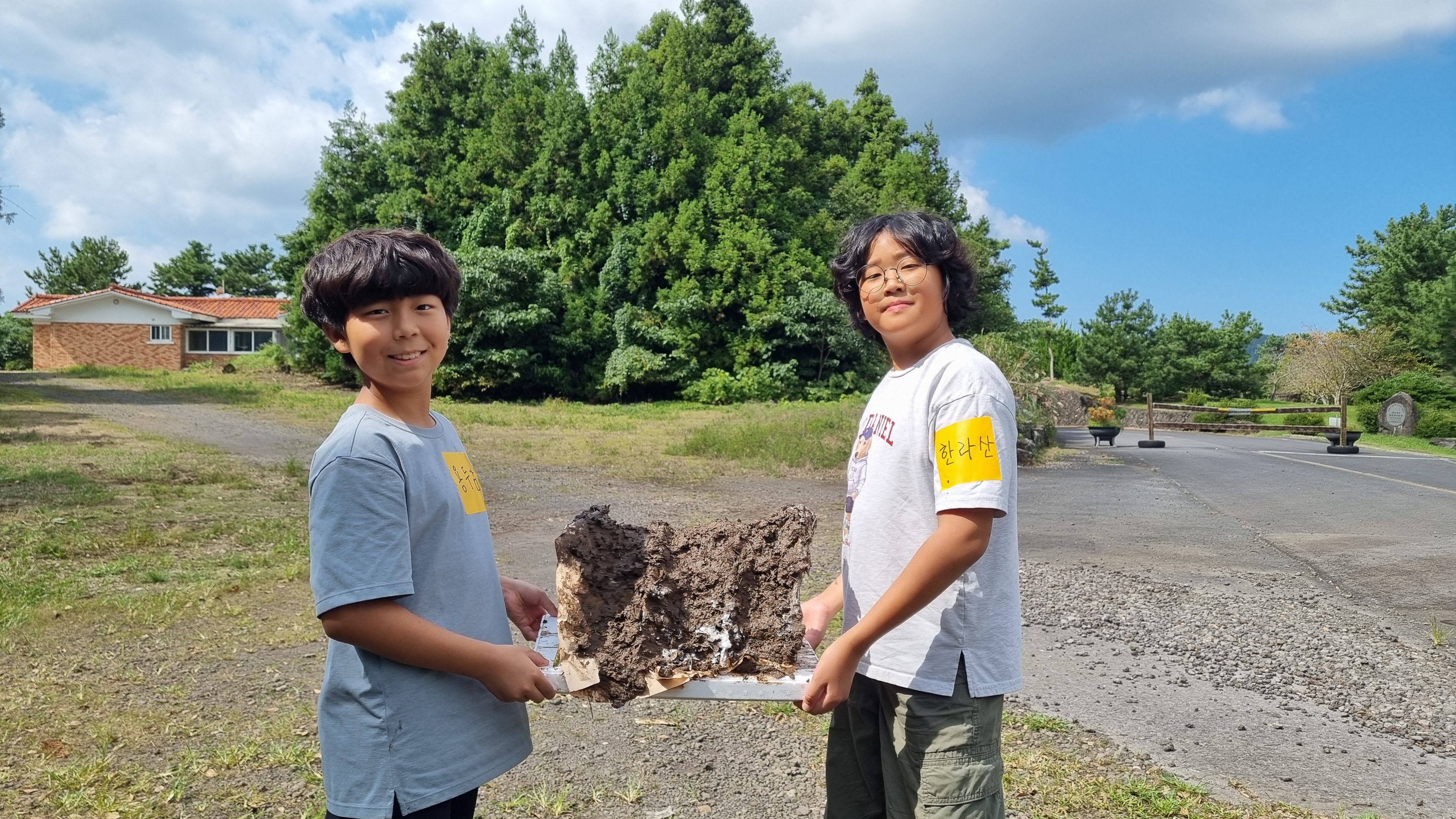 준비해온 신문지와 흙, 풀을 섞는다.
