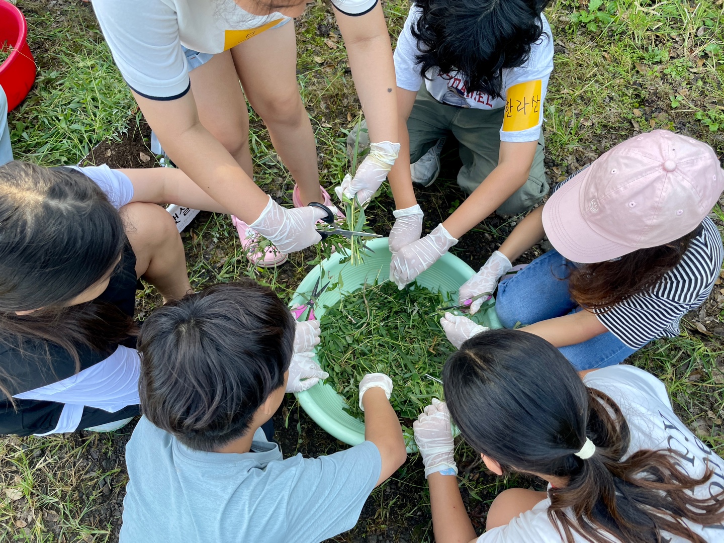 풀을 자르고, 흙을 파서 모은다.