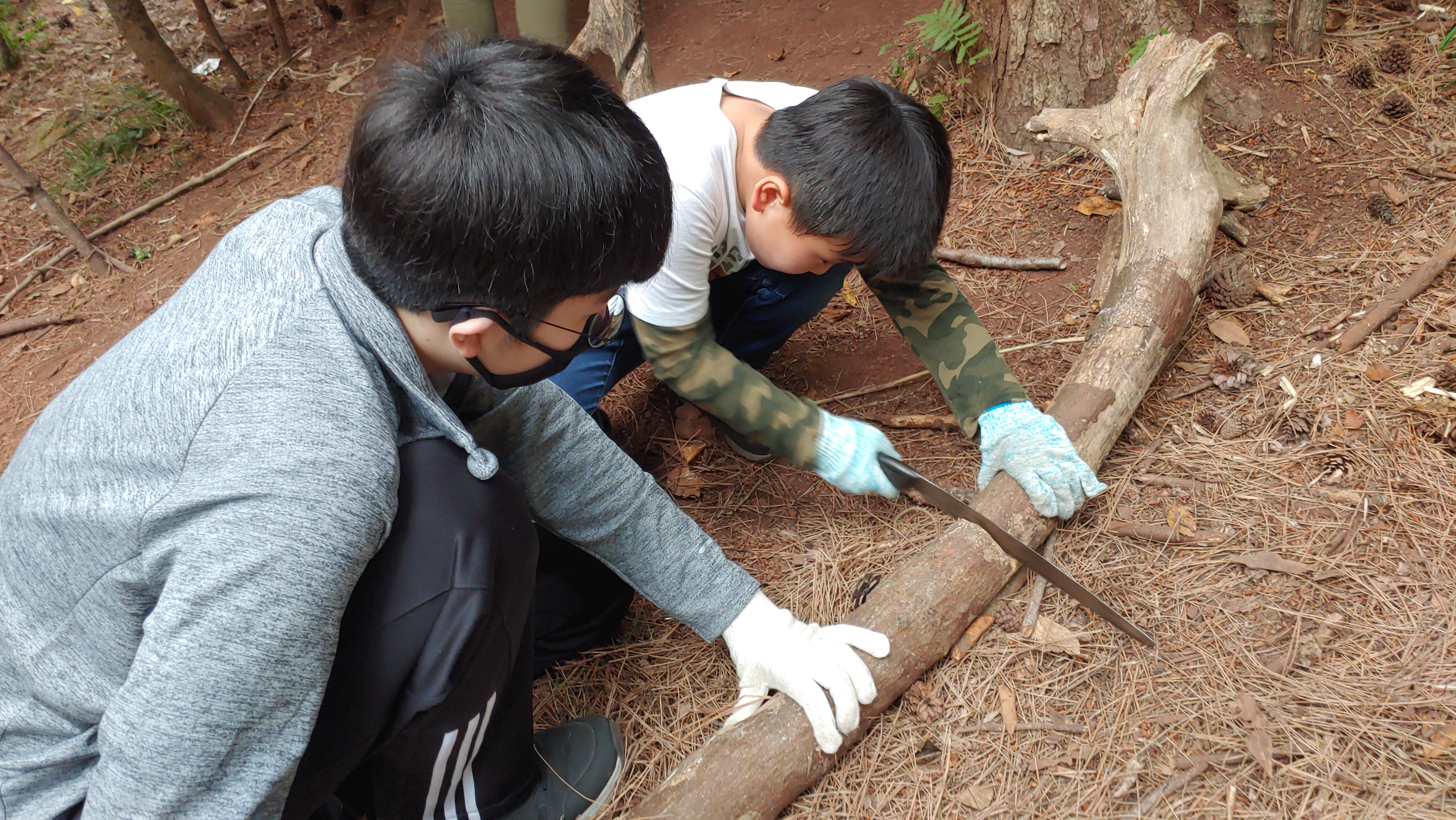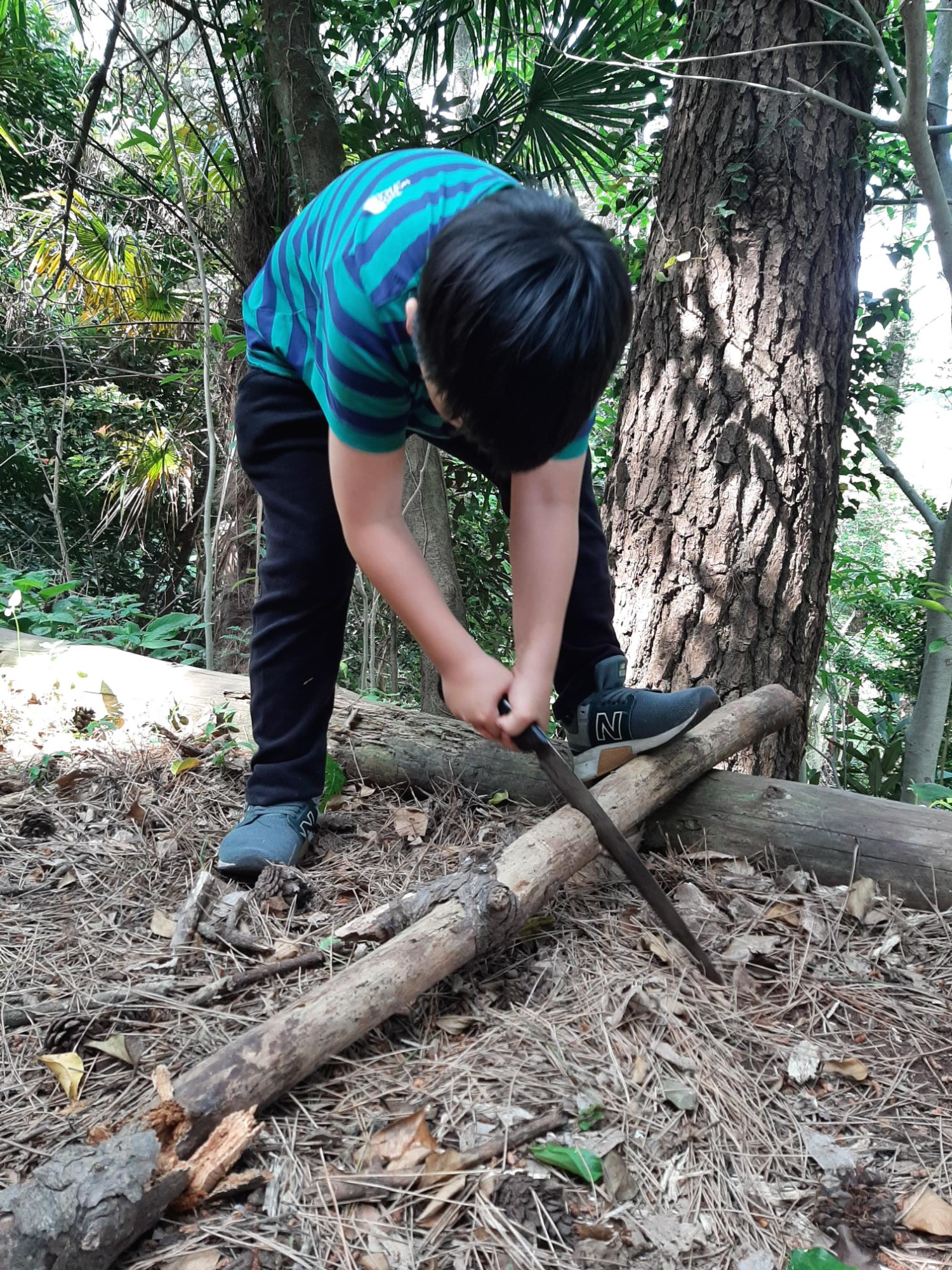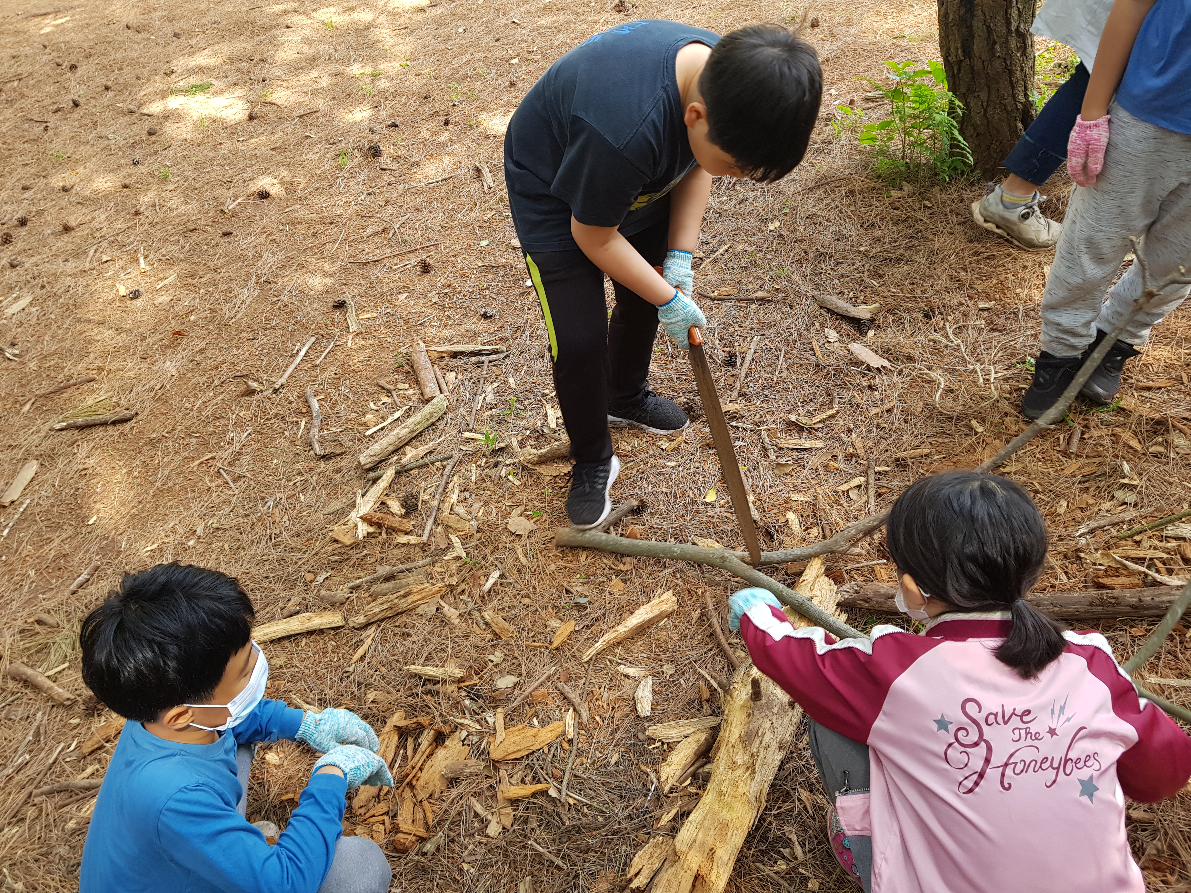 톱질 잘하는 봉사 형아의 도움을 받아 열심히 톱질하는 준영이^^