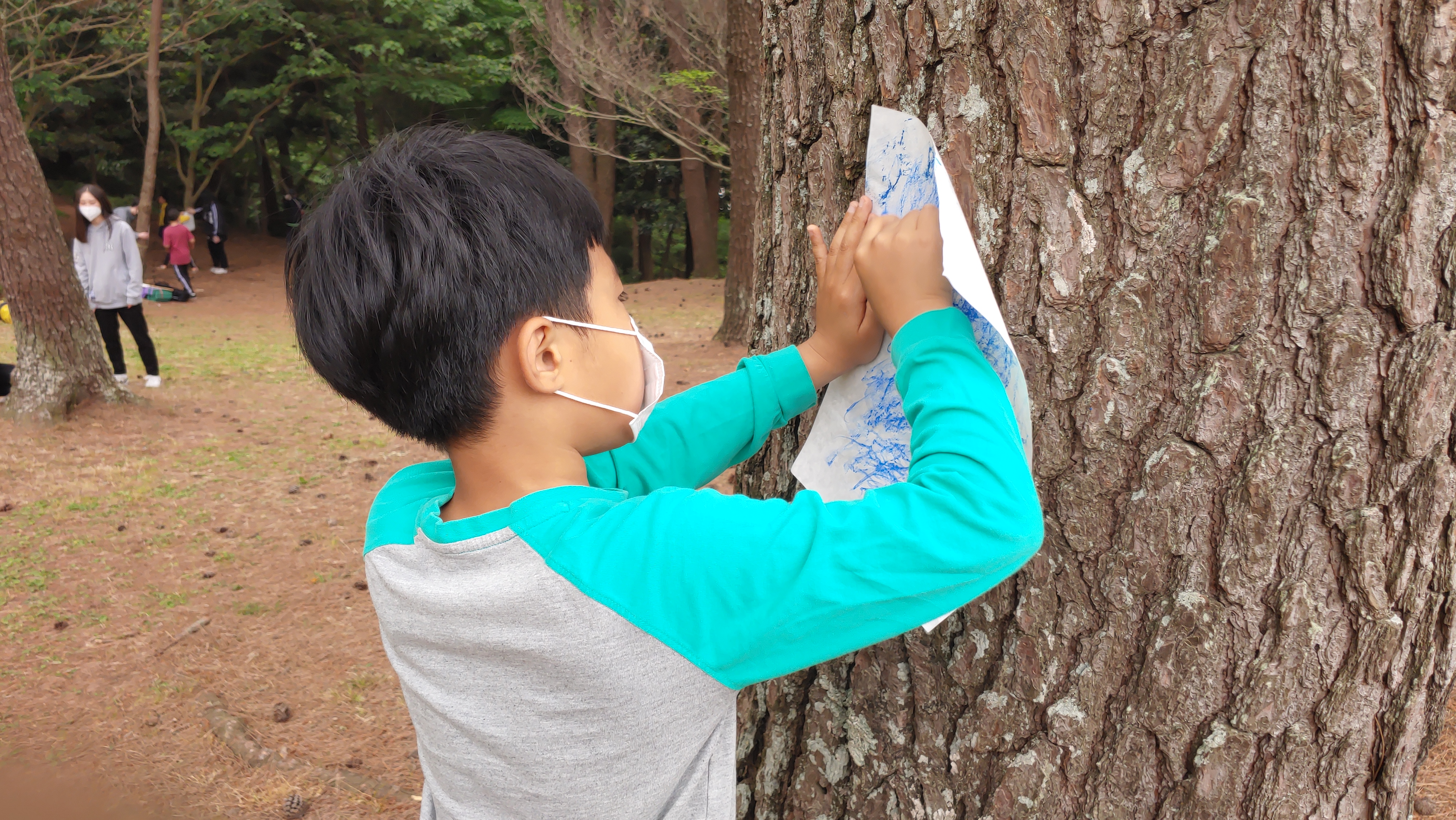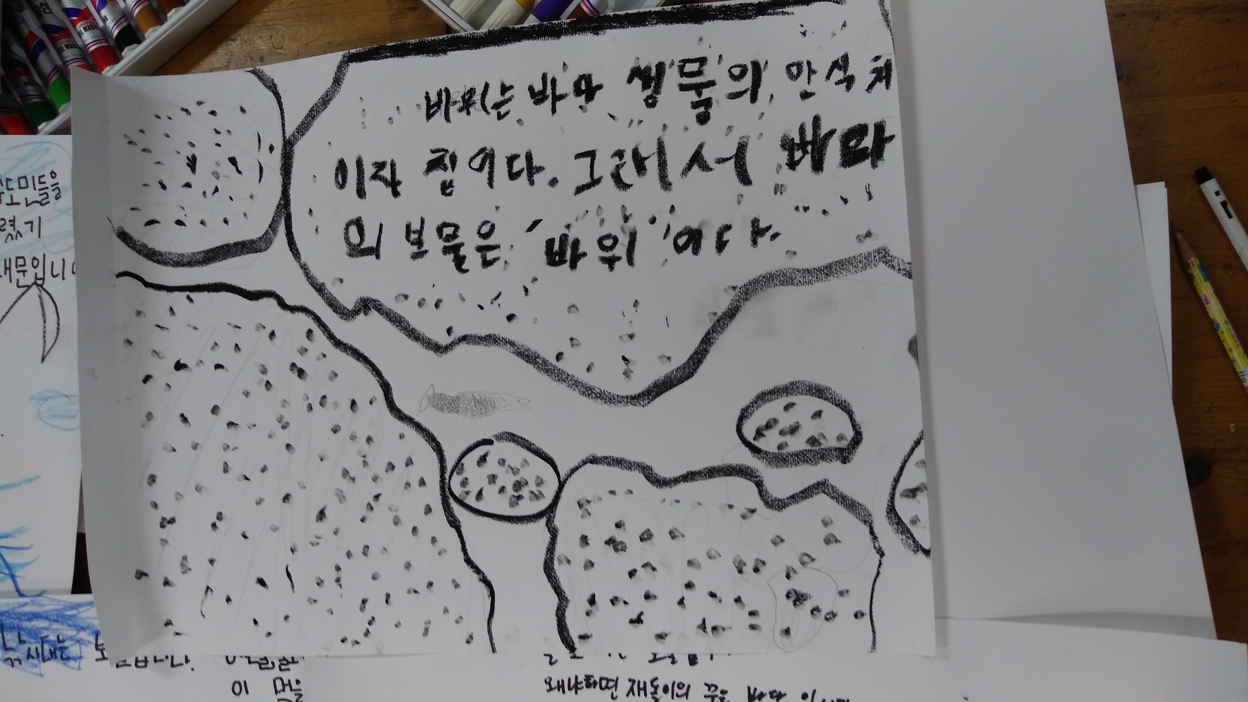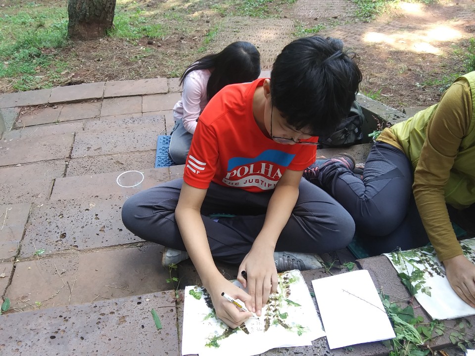 맨들 맨들한 나무를 알록하게 탁본 뜨는 정현이^^