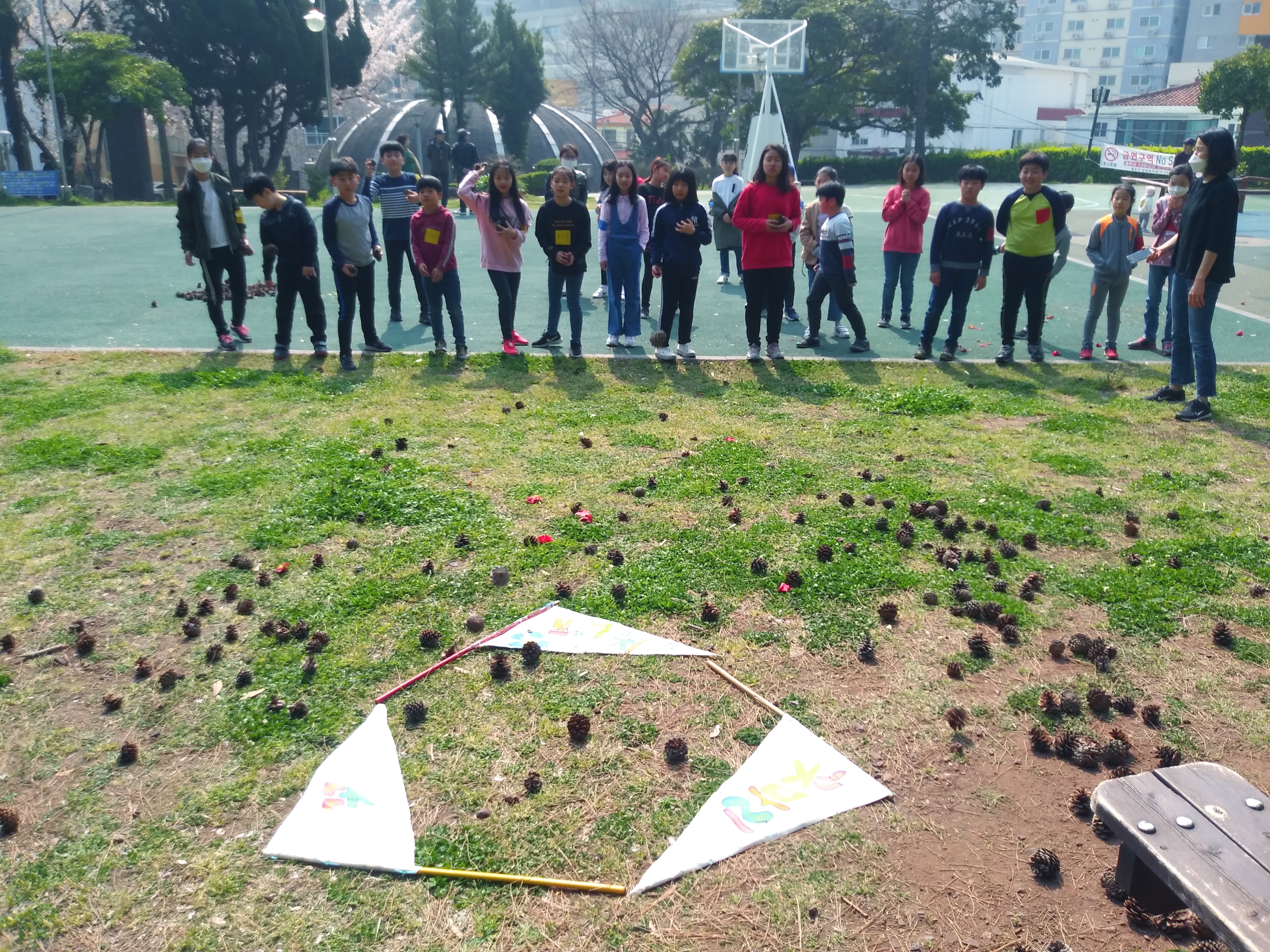 모아 놓은 솔방울로 '솔방울 던지기' 놀이해요~~~