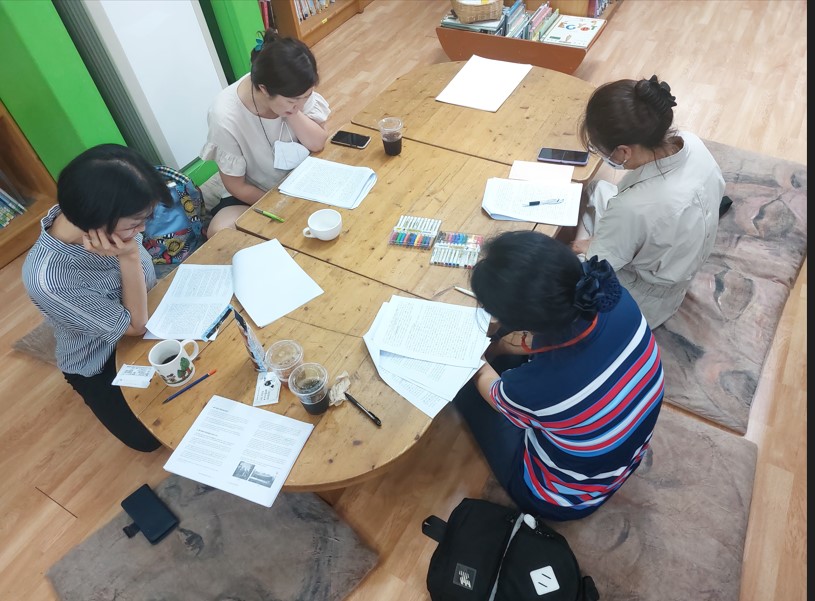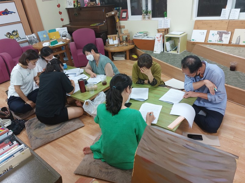 <사진 참조: 책으로 토론하는 청소년들 사진이다. >