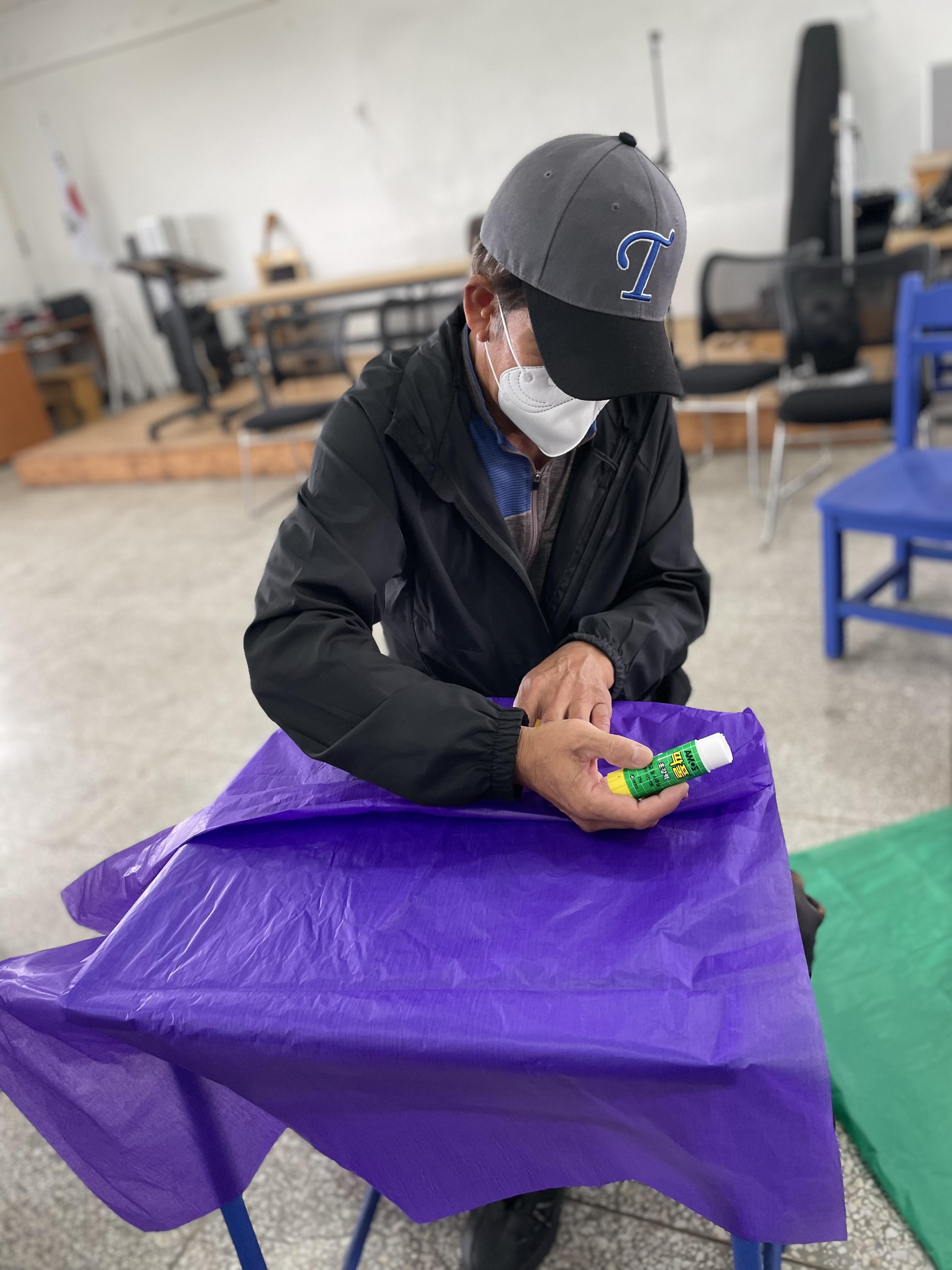 풀로 붙히는 이철성어르신.