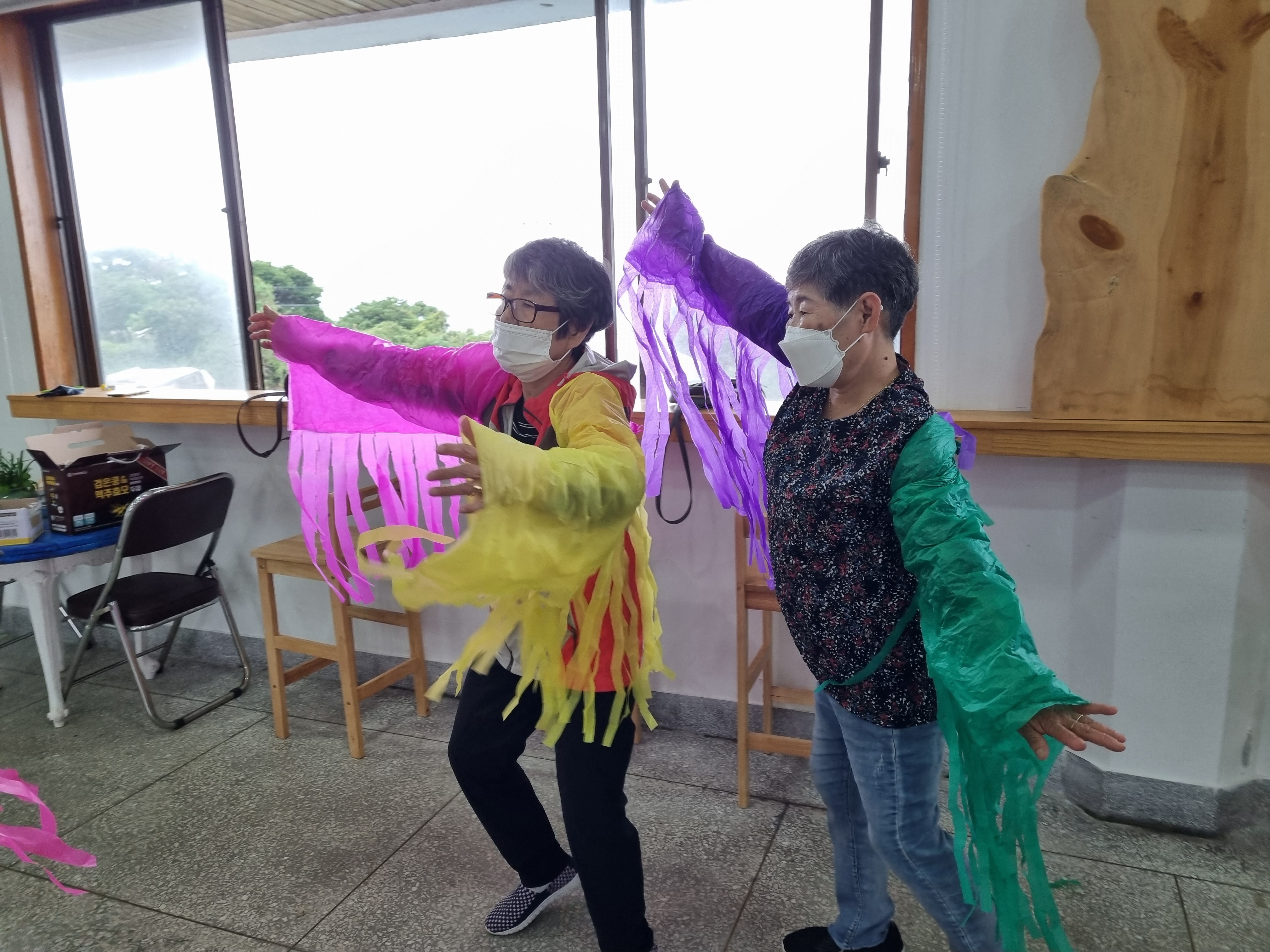 사락 사락 꽃지로 춤 소품을 만든다.