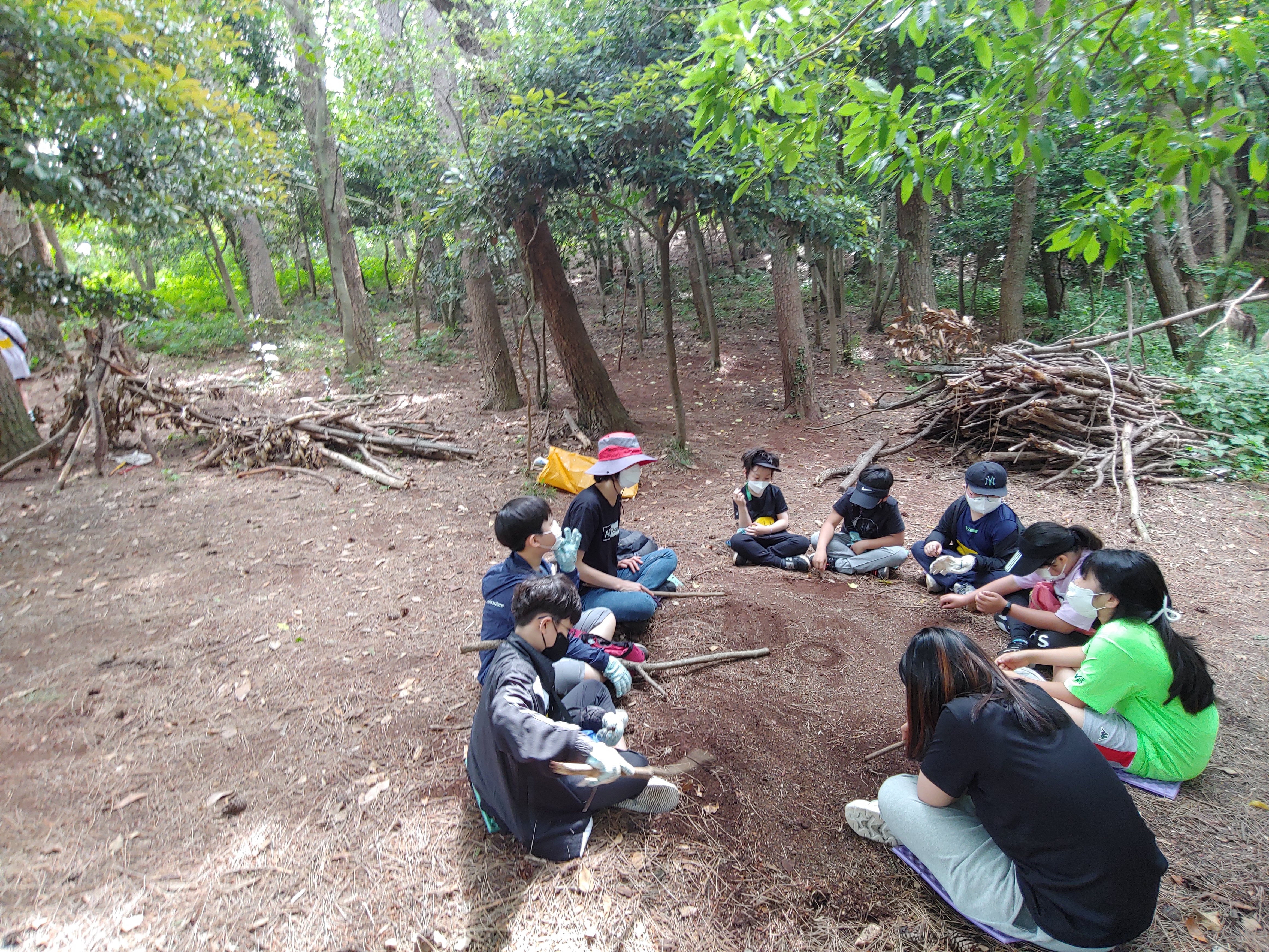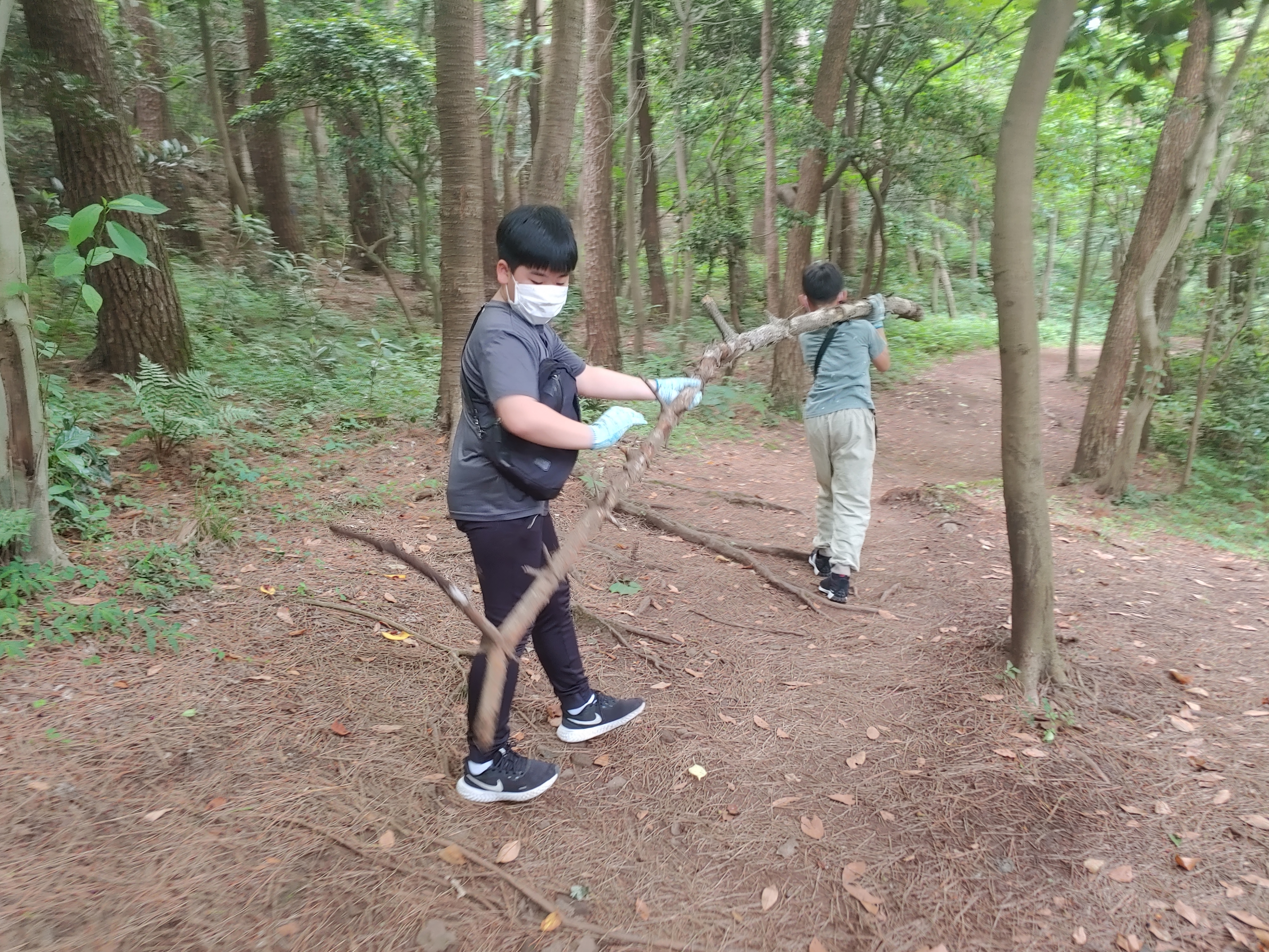 힘을 모아 기~~~인 막대기를 모아가는 성현이랑 유준이.