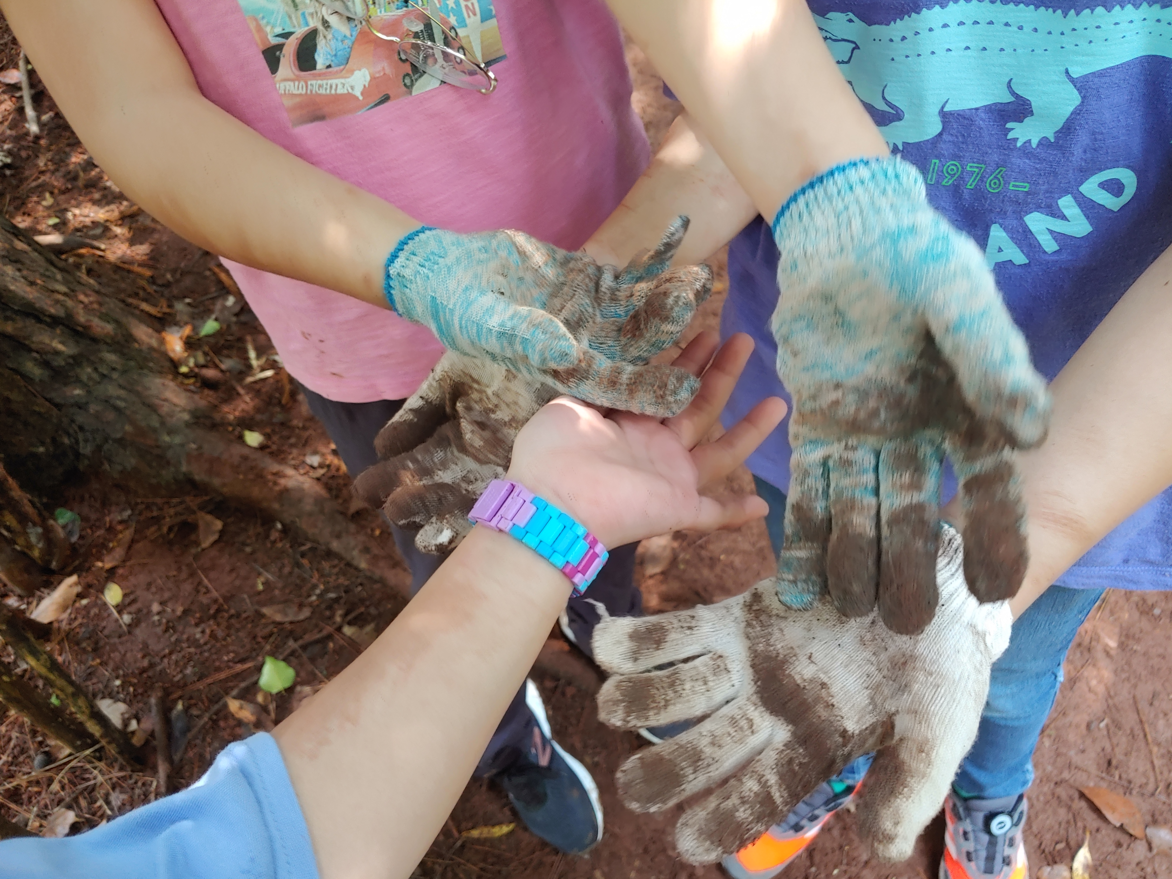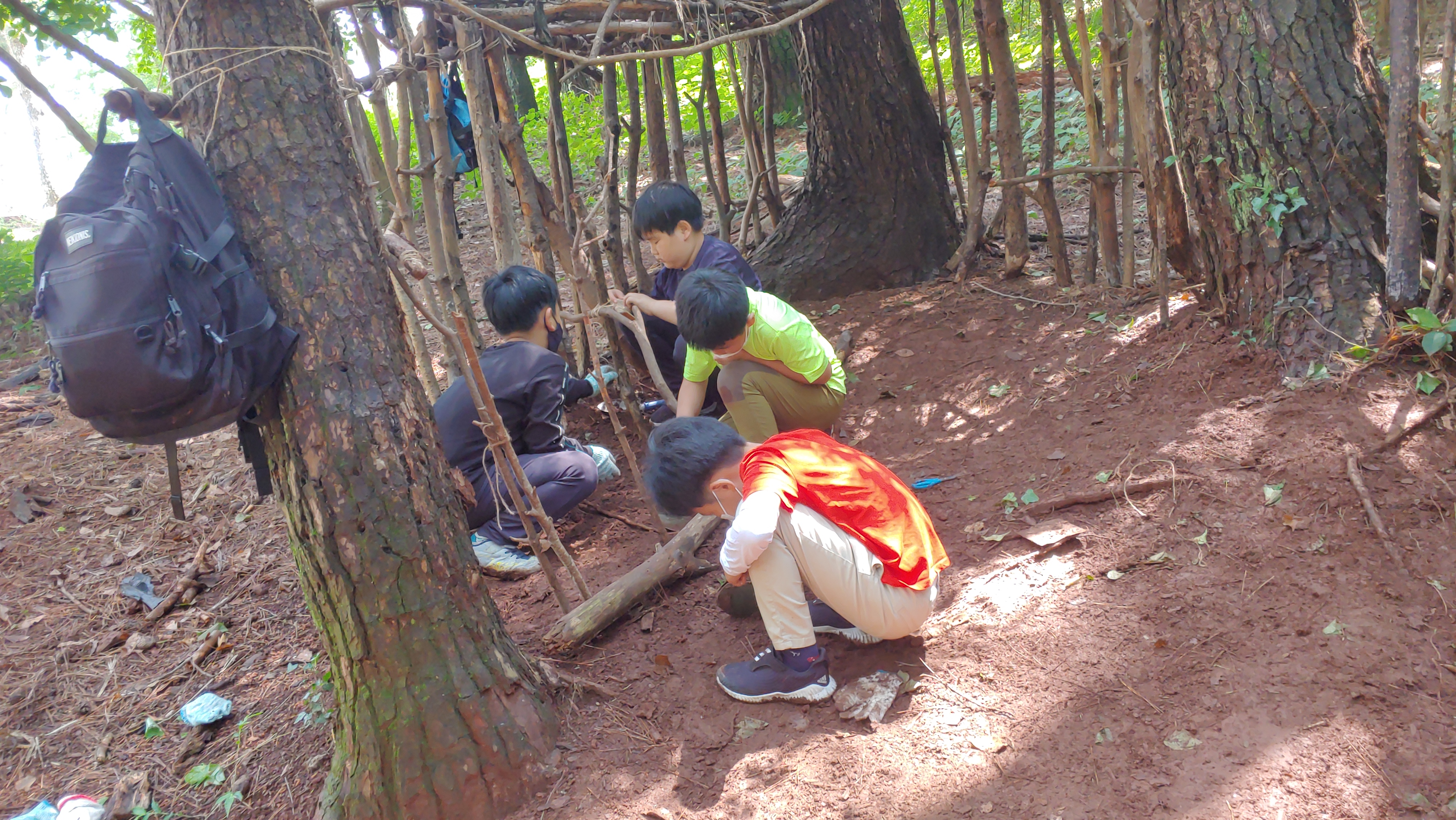 작업 도중 나온 지네에 아이들 환호합니다.