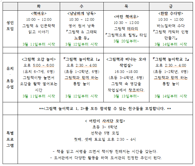※ 강좌들과 시간은 사정에 따라 변경될 수 있습니다.