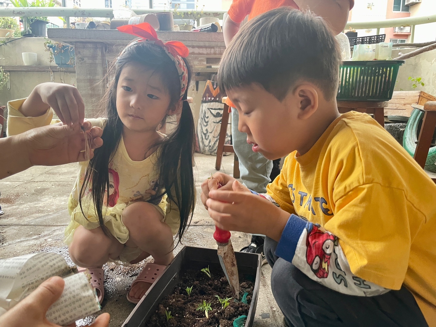 그 싹을 화분으로 옮기는 작업을 함께 합니다.
