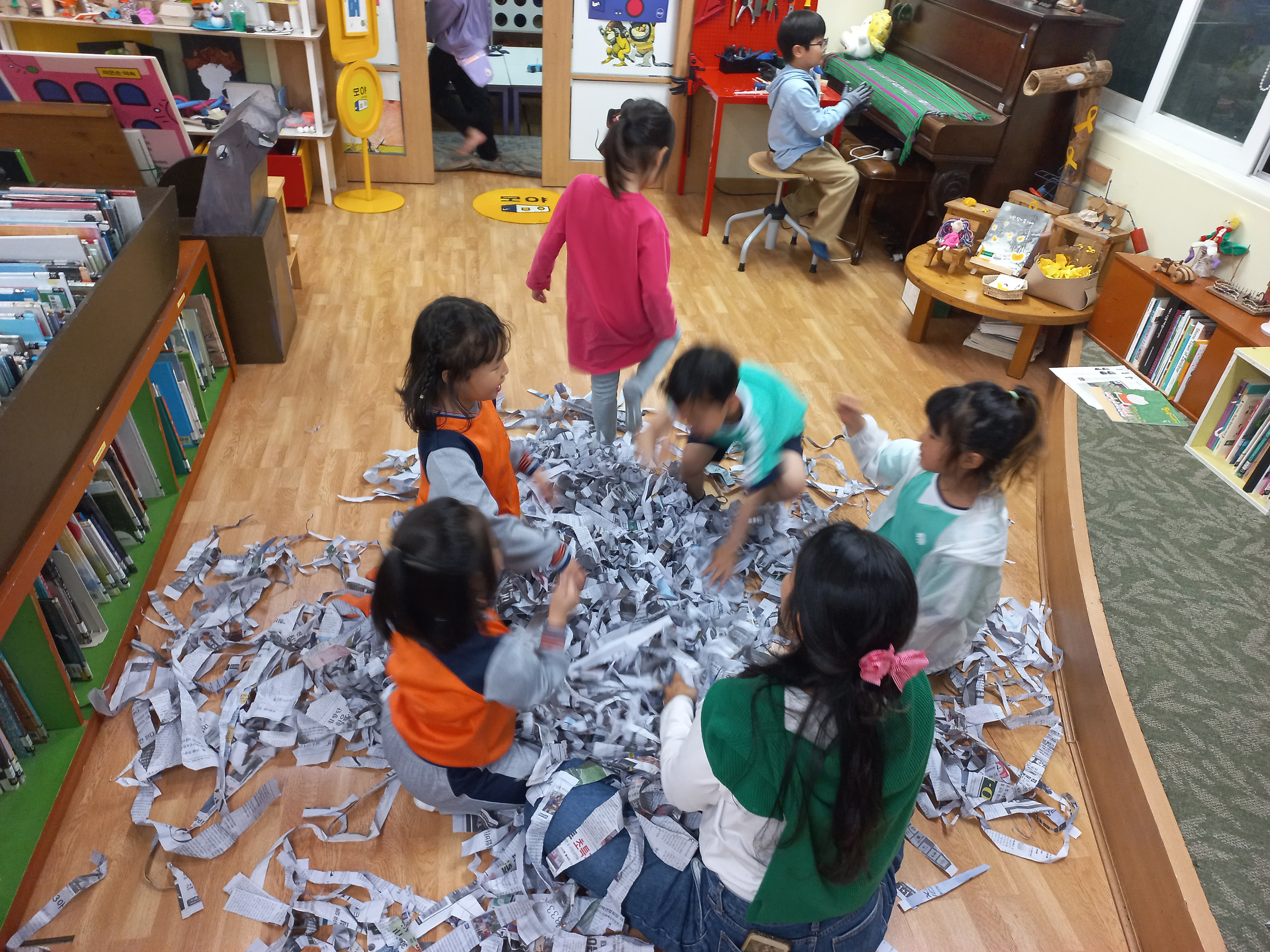 즐겁게 춤을 추면서 몸을 움직이고, 신문지 찢고 날려봅니다.