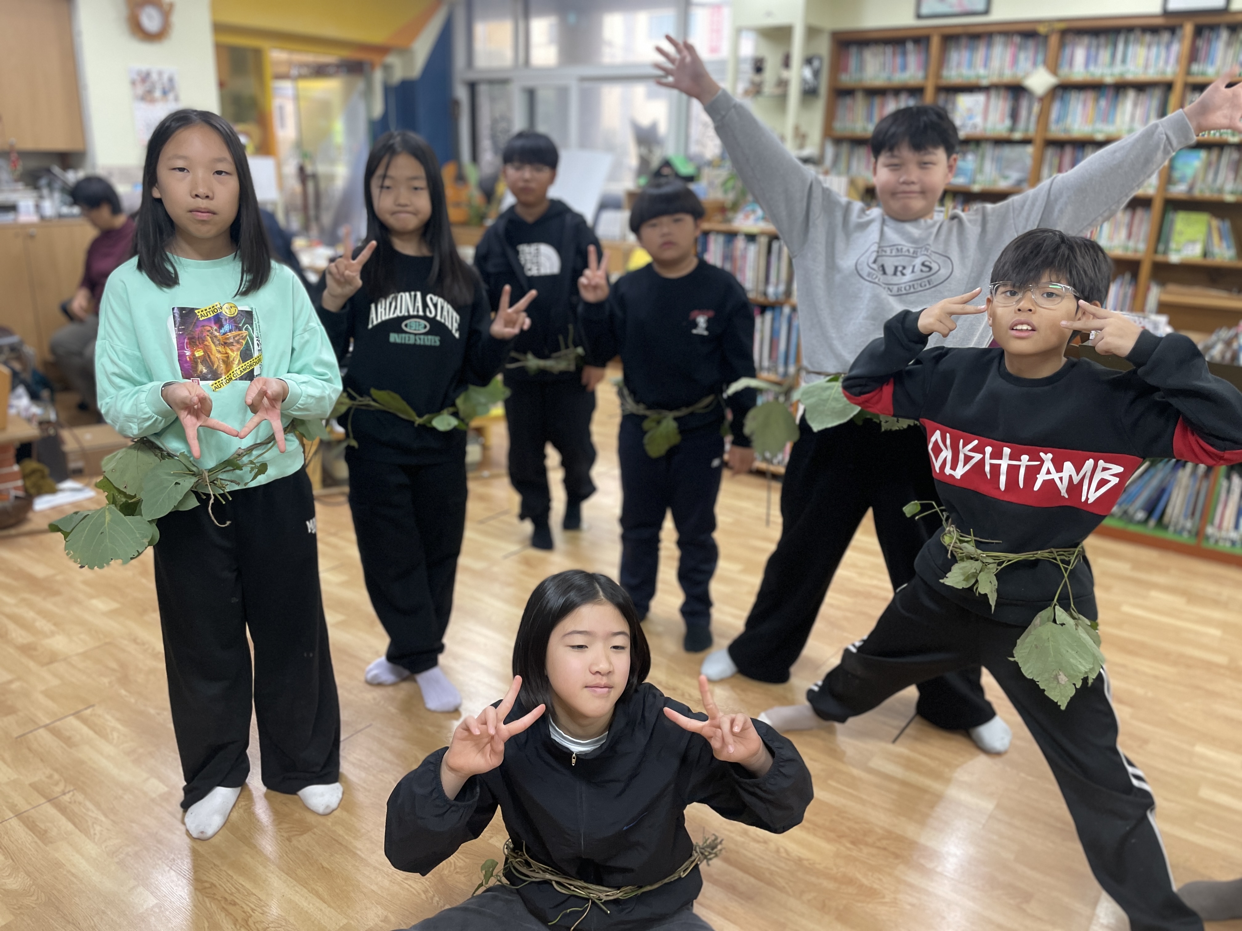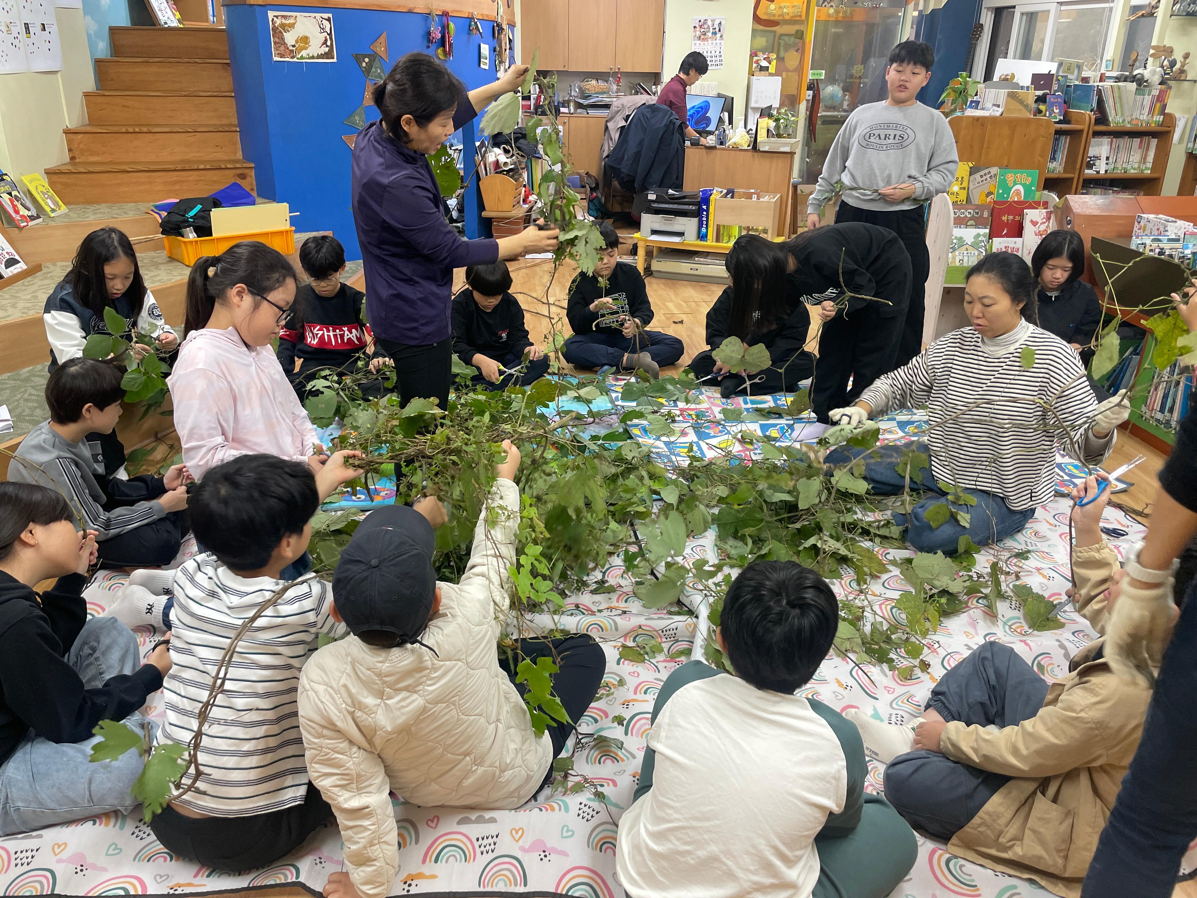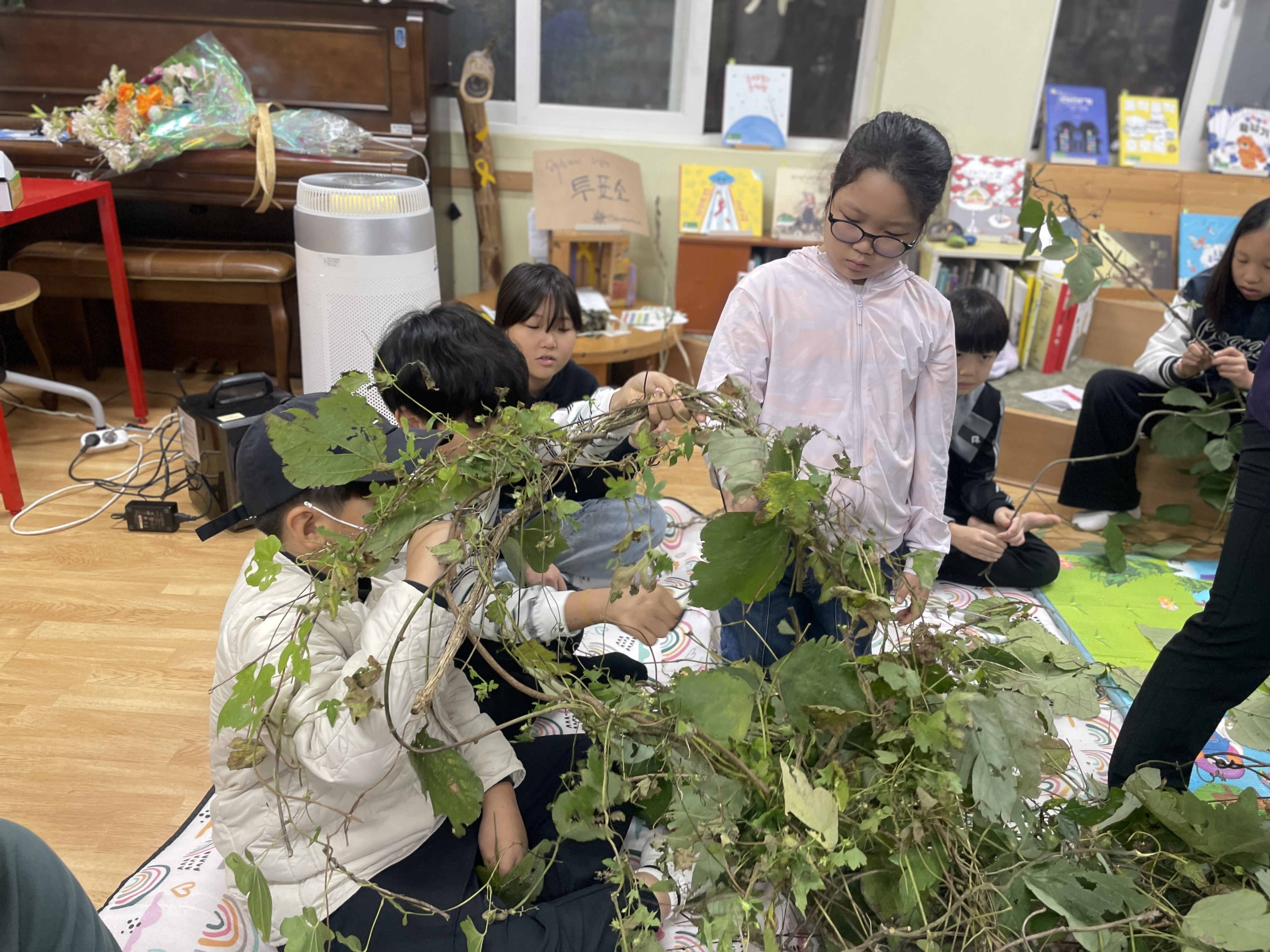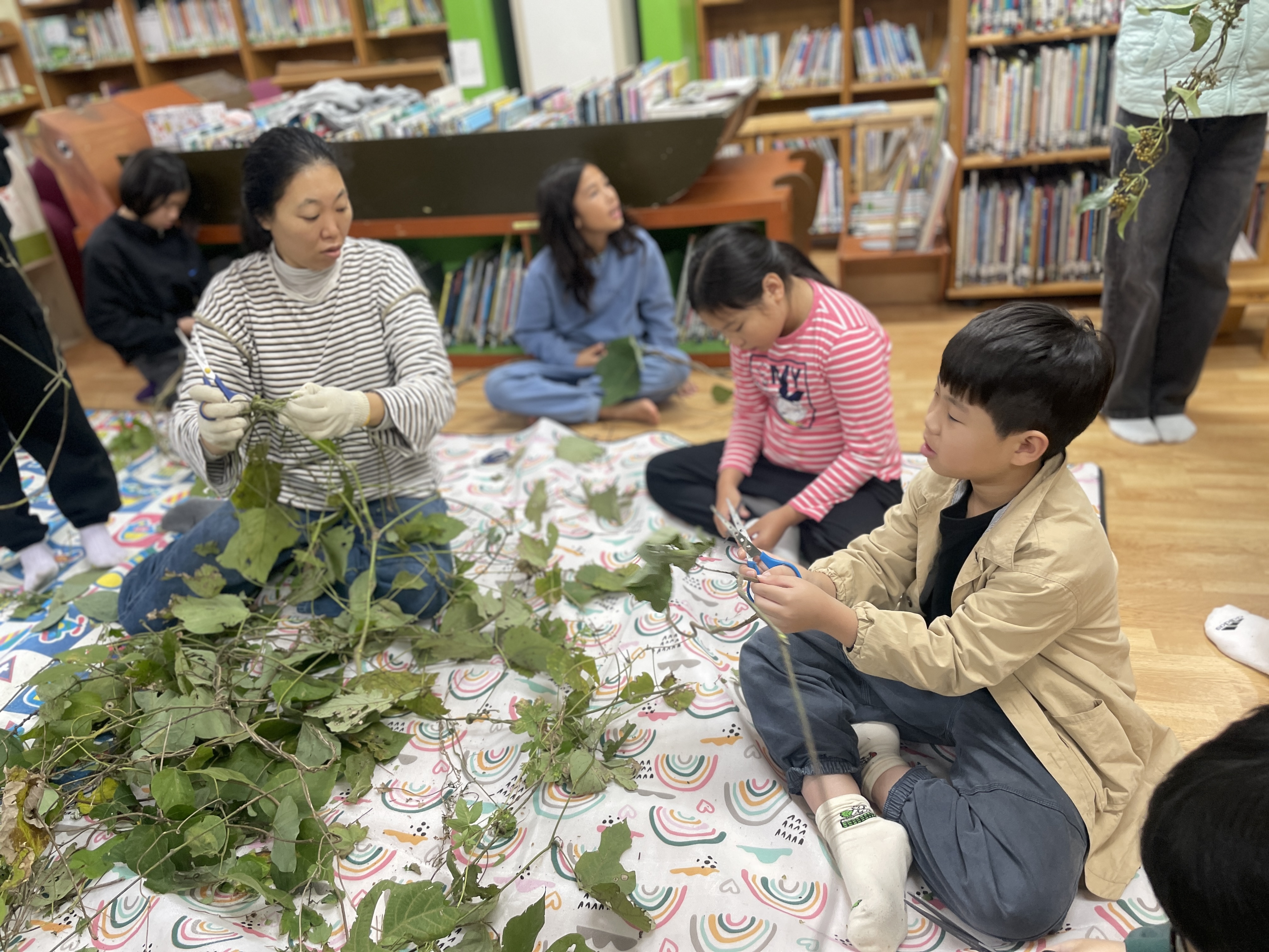 도서관에 돗자리를 깔고 칡덩굴을 가져왔다.