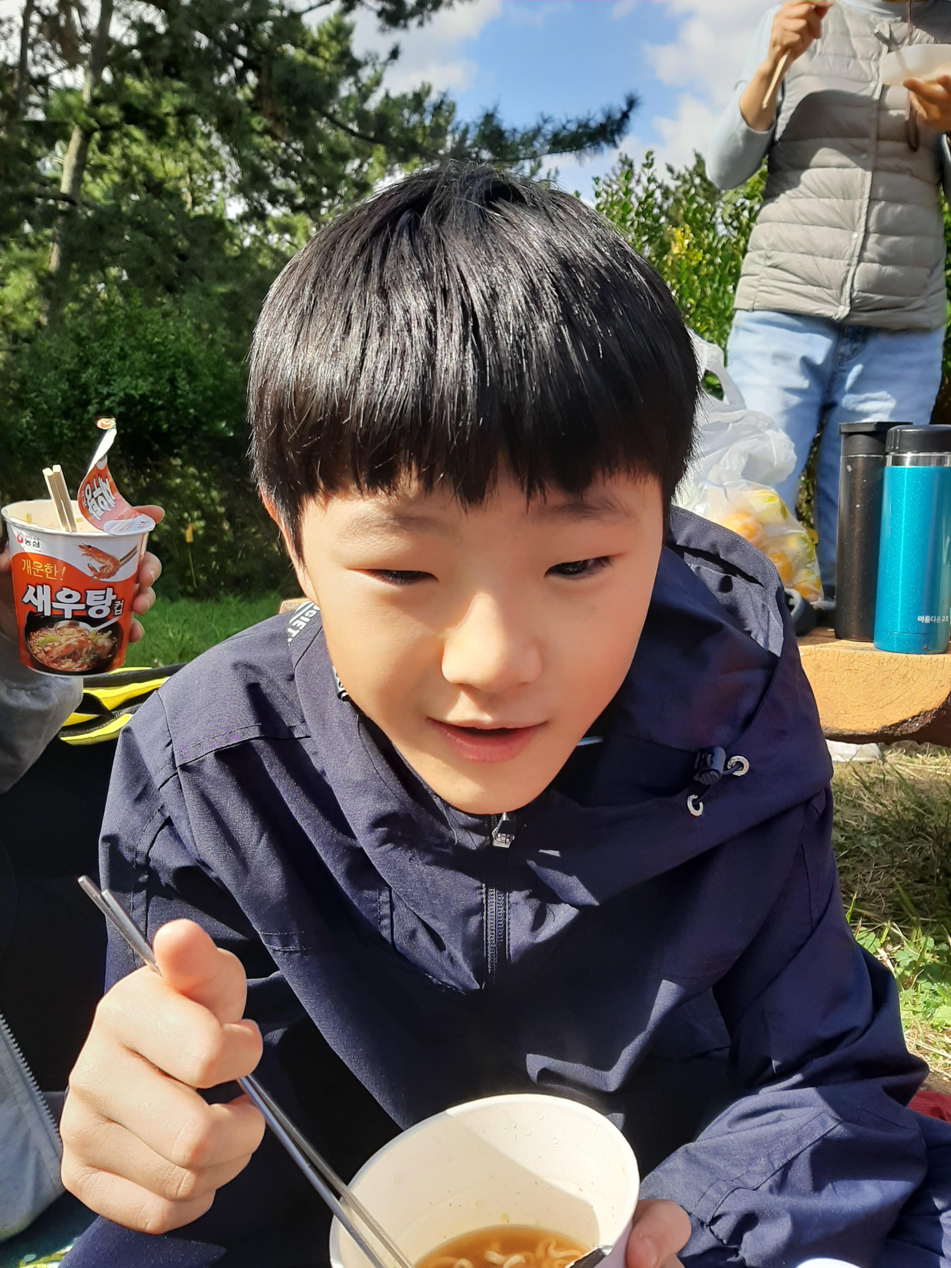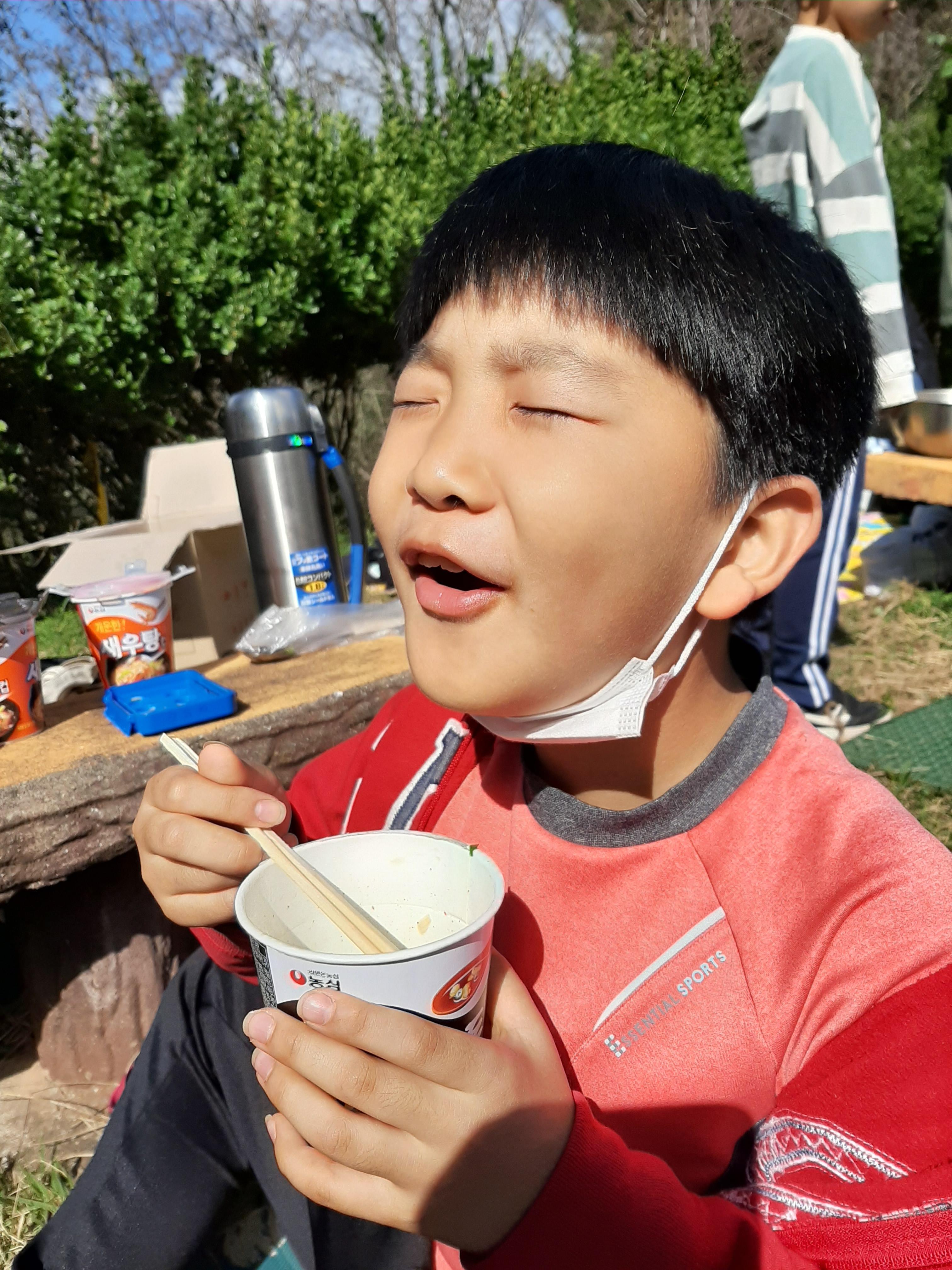 비빔밥 다 먹은 친구들은 따뜻한 컵 라면.