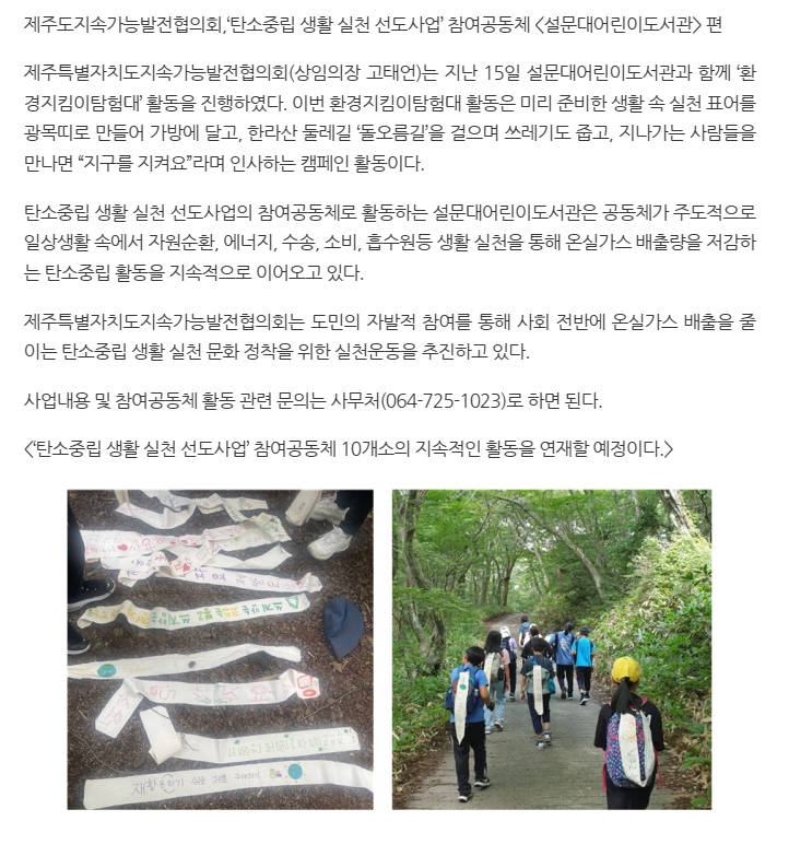 제주도지속가능발전협의회,‘탄소중립 생활 실천 선도사업’ 참여공동체 <설문대어린이도서관> 편 - 2023.8.16. 미디어제주 기사!