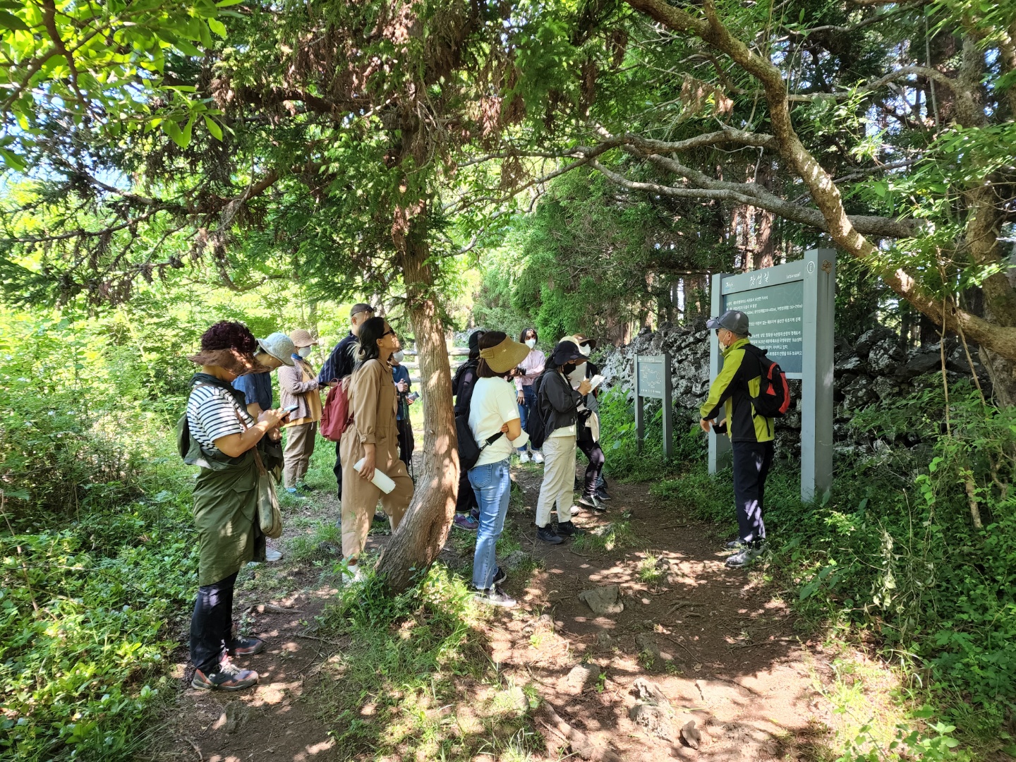 잣성길입구에서 녹산장부터 헌마공신 김만일에 대해 이야기를 듣는다.
